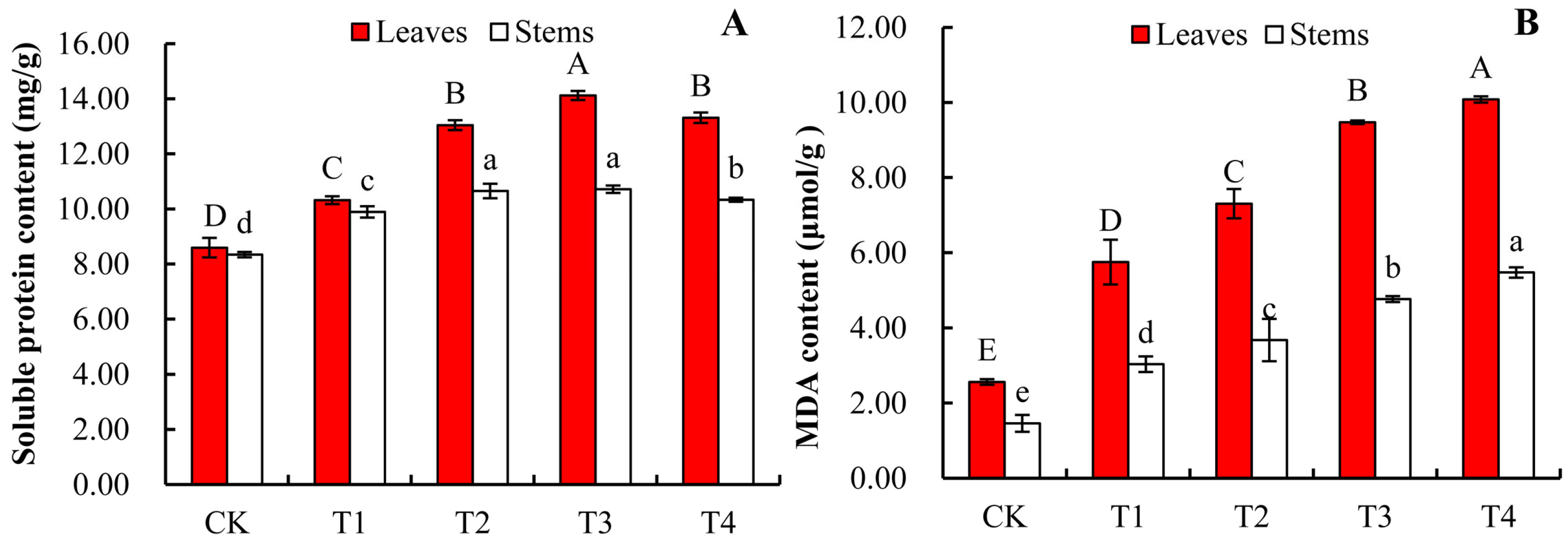 3.3. Effects of Salt Stress on Membrane Lipid Peroxidation and Osmotic Adjustment Substances in A. roxburghii