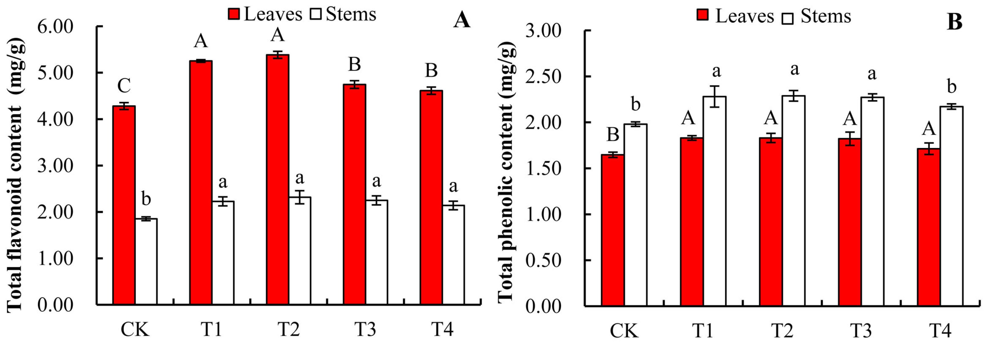 3.5. Effects of Salt Stress on Contents of Flavonoids and Total Phenols in A. roxburghii