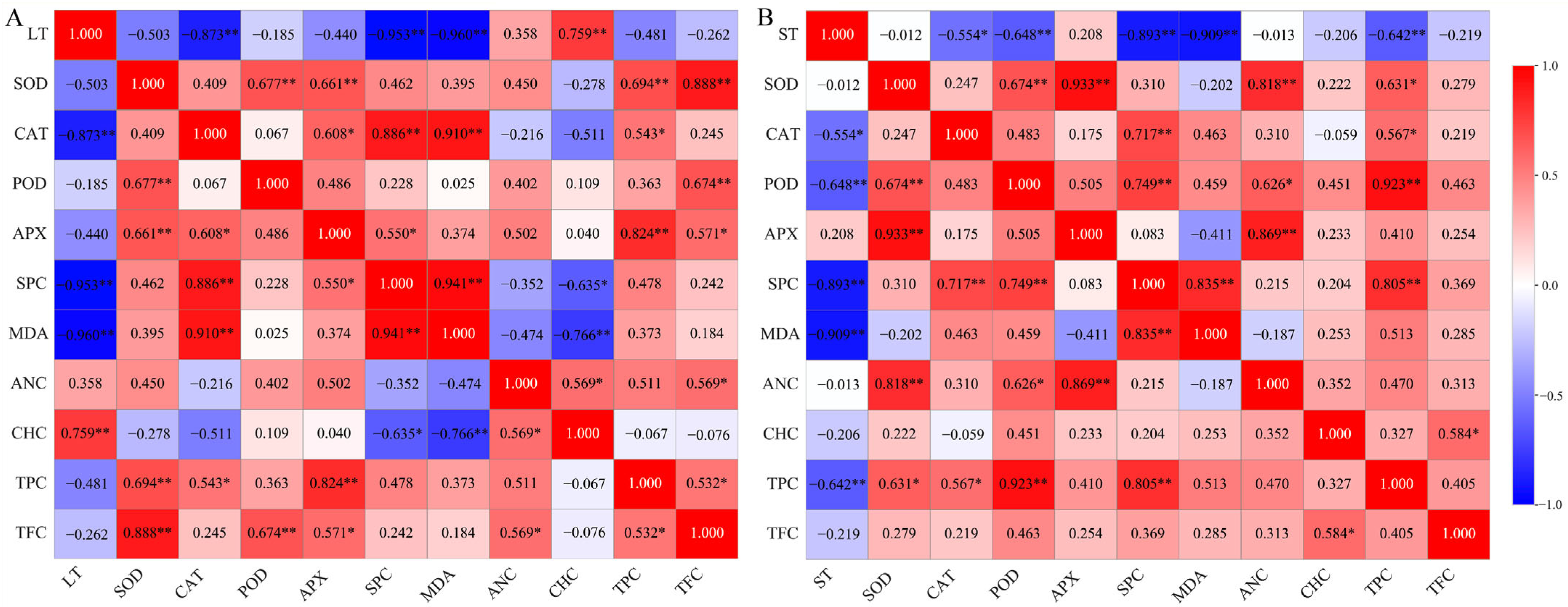 3.6. Correlation Analysis of Different NaCl Concentrations in Leaves and Stems of A. roxburghii