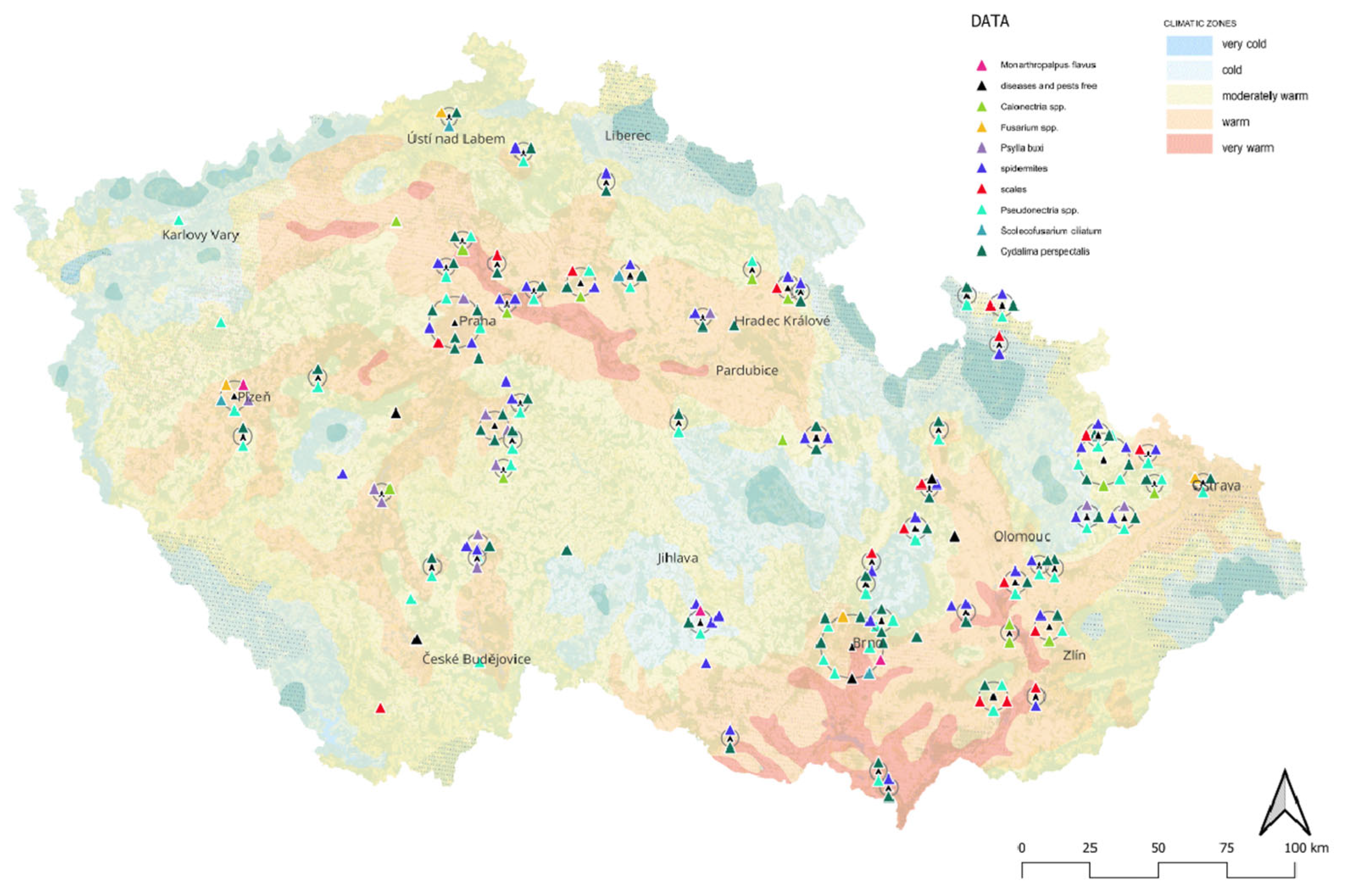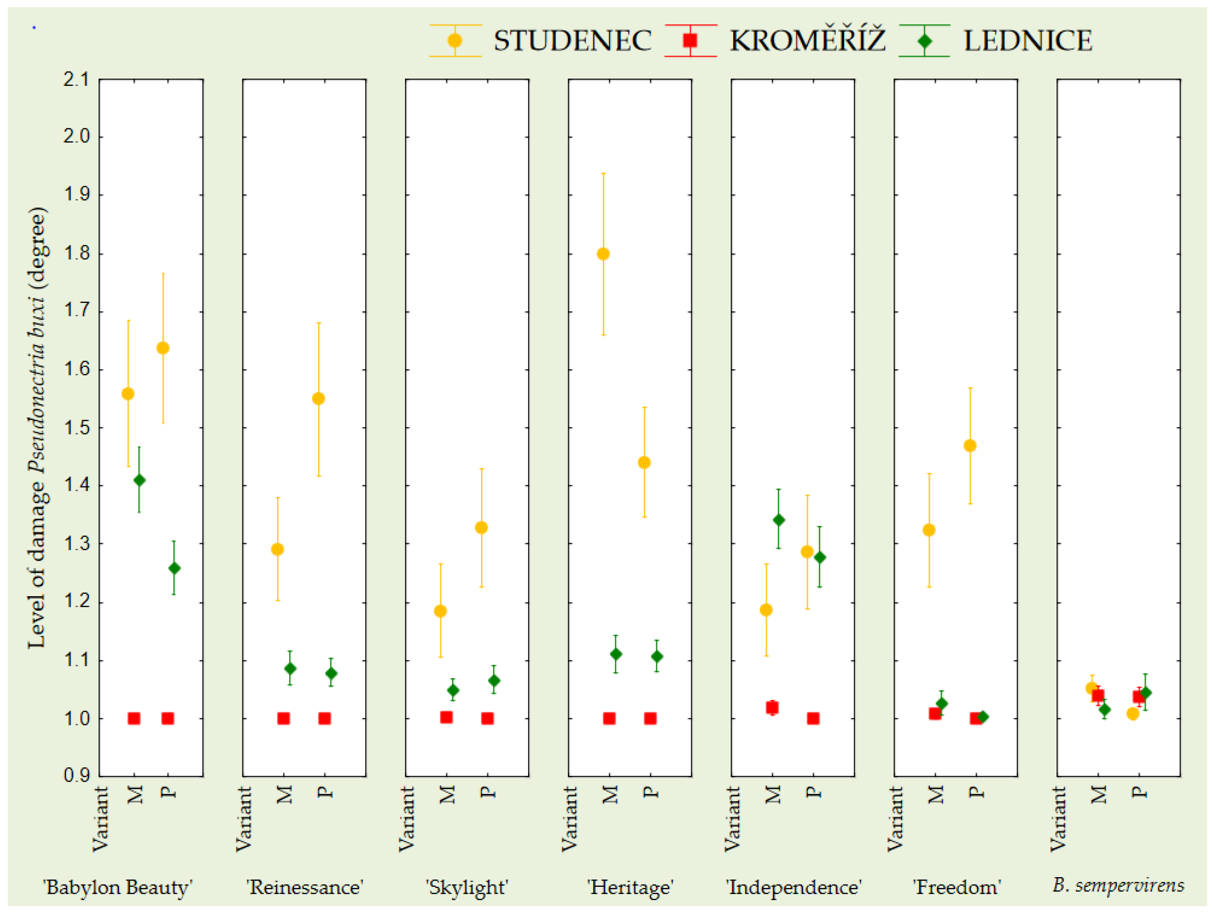 - Bartíková, M.; Holková, L.; Šafránková, I. Occurrence of boxwood blight (Calonectria pseudonaviculata and C. henricotiae) in historical gardens in the Czech Republic. Eur. J. Plant Pathol. 2020, 158, 1007–1019. [Google Scholar] [CrossRef]