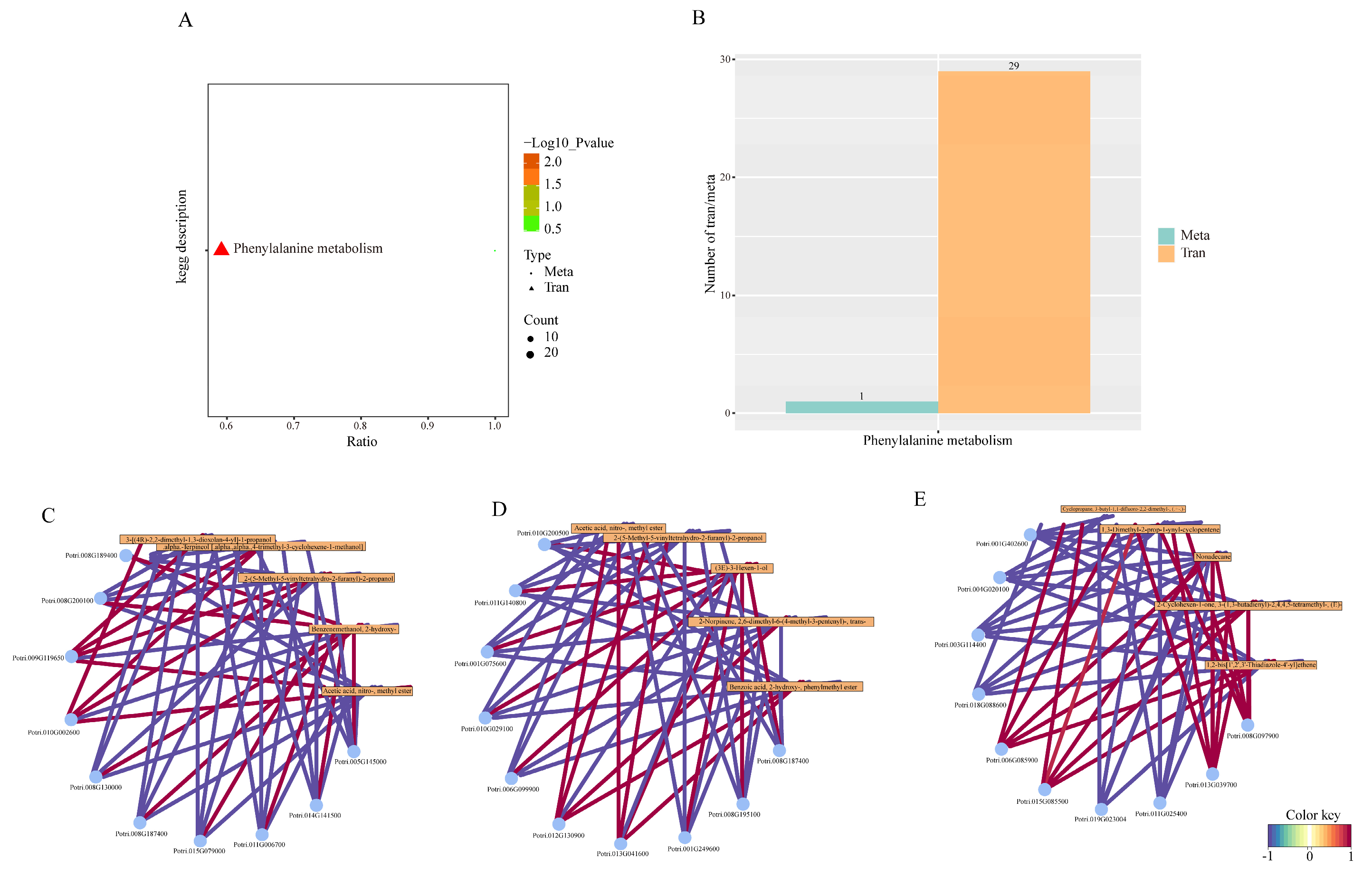 2.8. Combined Analysis of Transcriptome and Metabolome