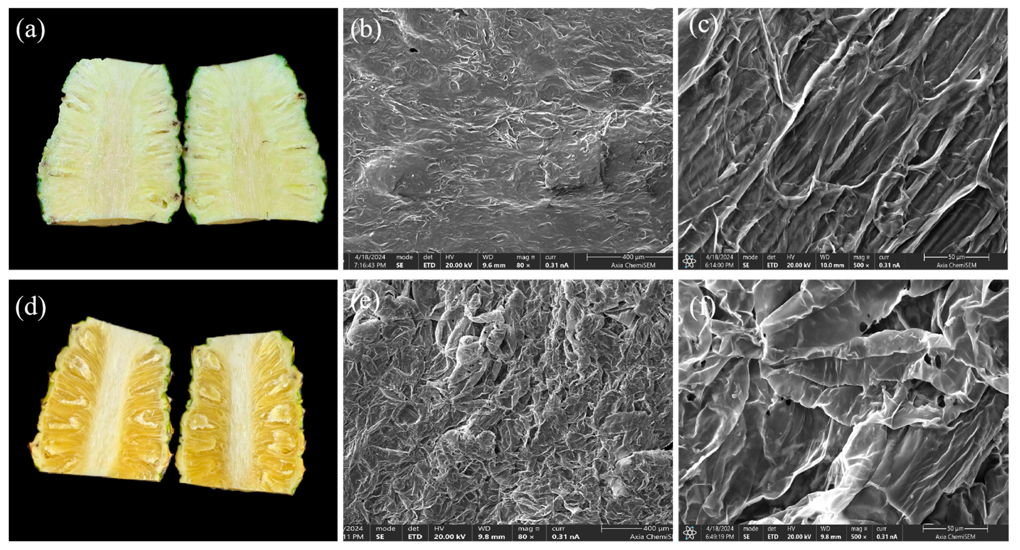 - Wang, W.B.; Yao, Y.L.; Li, C.I.; He, J.J.; Fu, Q.; Yang, Y.Q.; Lin, S.P.; Zhang, X.M. Effects of Preharvest High Temperature Stress on Physiological Characteristics and Fruit Quality in Pineapple. South China Fruits 2025, 1007–1431. (In Chinese) [Google Scholar] [CrossRef]