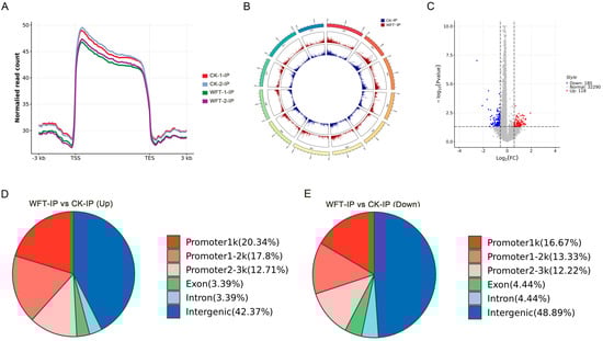 Genome-wide distribution of H3K27me3 in S. melongena. Peak signal distribution plots (A), Circos plot across the genome (B), volcano plot (C), and peak annotated abundance (D,E) for H3K27me3 in eggplant leaves under both uninfested and infested with western flower thrips (WFT). Note: The x-axis represents normalized gene coordinates, with the transcription start site (TSS) and transcription end site (TES) labeled. The interval from −3.0 to 3.0 corresponds to 3 kb upstream of the TSS and 3 kb downstream of the TES, respectively. The y-axis shows the average normalized signal intensity at each position. (A) Promoter regions (1 kb, 1–2 kb, and 2–3 kb) are defined as the intervals upstream of the TSS and downstream of the TES. Exon and Intron denote the respective gene regions, while Intergenic regions are defined as all other areas. The pie chart displays the proportion of peaks annotated to each functional category, with different colors representing different functional regions (D,E). CK-IP: ChIP-seq group uninfested by WFT; WFT-IP: ChIP-seq group infested by WFTs for 3 h.