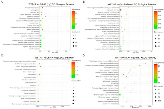 GO (A,B) and KEGG (C,D) enrichment analyses of genes associated with H3K27me3 peaks in eggplant leaves under uninfested and WFT-infested conditions. CK-IP: ChIP-seq group uninfested by WFT; WFT-IP: ChIP-seq group infested by WFTs for 3 h.