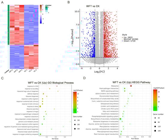 GO annotation analysis indicated that the majority of genes were associated with stress responses, with notable enrichments in chitin, wounding, and defense responses, as well as ribosomal large subunit biogenesis (Figure 3C). KEGG pathway analysis showed that the ribosome pathway exhibited the most significant enrichment, followed by pathways associated with plant–pathogen interactions, MAPK signaling, and alpha-linolenic acid metabolism, among others (Figure 3D).