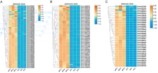 A heatmap was used to examine the variations in expression levels of ABA (A), JA (B), and SA (C) hormone pathway up-regulated genes between WFT and CK. CK, the transcriptome group uninfested by WFT; WFT, the transcriptome group infected by WFTs for 3 h.