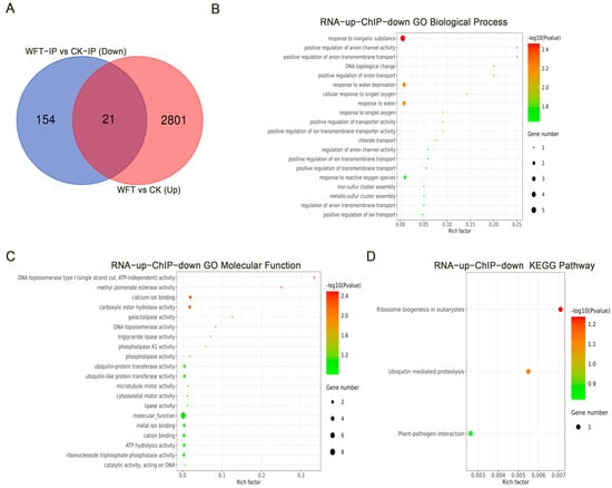 A Venn diagram was utilized to compare the 2822 upregulated genes identified via RNA-Seq after WFT infestation (Figure 3B) with 175 genes identified by H3K27me3 modification peak-down, showing 21 overlapping genes (Figure 5A). The shared genes underwent GO and KEGG analyses. GO biological process analysis indicated primary involvement in response to inorganic substances, positive regulation of anion channel activity, positive regulation of anion transmembrane transport, DNA topological changes, positive regulation of anion transport, and response to water deprivation (Figure 5B). GO molecular function analysis showed major participation in DNA topoisomerase type I (single-strand cut, ATP-independent) activity, methyl jasmonate esterase activity, calcium ion binding, carboxylic ester hydrolase activity, and galactolipase activity (Figure 5C). KEGG pathway analysis revealed enrichment in ribosome biogenesis in eukaryotes, ubiquitin-mediated proteolysis, and plant–pathogen interaction (Figure 5D).