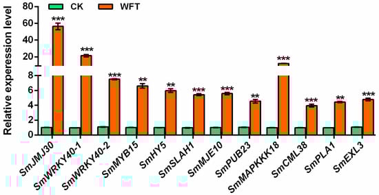 qPCR was used to verify the expression levels of twelve genes in the transcriptome of the leaves of eggplants inoculated with the WFT. CK, the group uninfested by WFT; WFT, the group infested by WFTs for 3 h., Values are the mean ± SE (n = 3). Statistical significance was determined by Student’s t-test: ** p < 0.01, or *** p < 0.001.