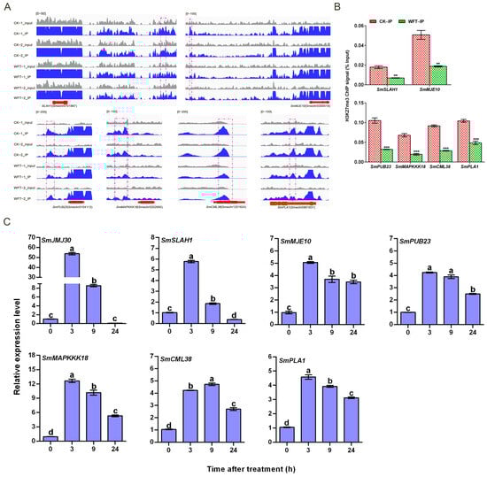 Twelve upregulated genes identified via RNA-Seq post WFT infestation (Figure 3B) were selected for RT-qPCR validation, confirming their expression trends consistent with the transcriptome data. Notably, histone demethylase SmJMJ30 showed the highest expression level, 55.47-fold higher than the control, followed by SmWRKY40-1 and SmMAPKKK18, with expression levels of other genes at least four times higher than the control (Figure 6). Six genes with reduced H3K27me3 were selected: SmSLAH1, SmMJE10, SmPUB23, SmMAPKKK18, SmCML38, and SmPLA1. Among these, SLAH1 is associated with ABA and MeJA [44]. Additionally, PLA and MJE are associated with JA synthesis and its active forms [45,46,47], whereas PUB23 and MAPKKK18 are linked to ABA signaling [48,49]. CML38 is broadly involved in different stress responses [50,51]. The differential peak distributions of these genes differed, with SmSLAH1, SmMJE10 and SmPUB23 situated upstream of the TSS, and SmMAPKKK18, SmCML38, and SmPLA1 located downstream of the TSS (Figure 7A). Meanwhile, H3K27me3 enrichment in the central regions of the differential peaks of these six genes was validated through ChIP-qPCR experiments, confirming a reduction in H3K27me3 enrichment levels following WFT feeding (Figure 7B). Furthermore, except for SmCML38, the expression levels of six genes peaked at 3 h after WFT feeding, especially for SmJMJ30 (Figure 7C). These findings indicate a negative correlation between the H3K27me3 enrichment level and gene expression levels potentially involved in ABA and JA signaling pathways in eggplants subjected to WFT infestation.