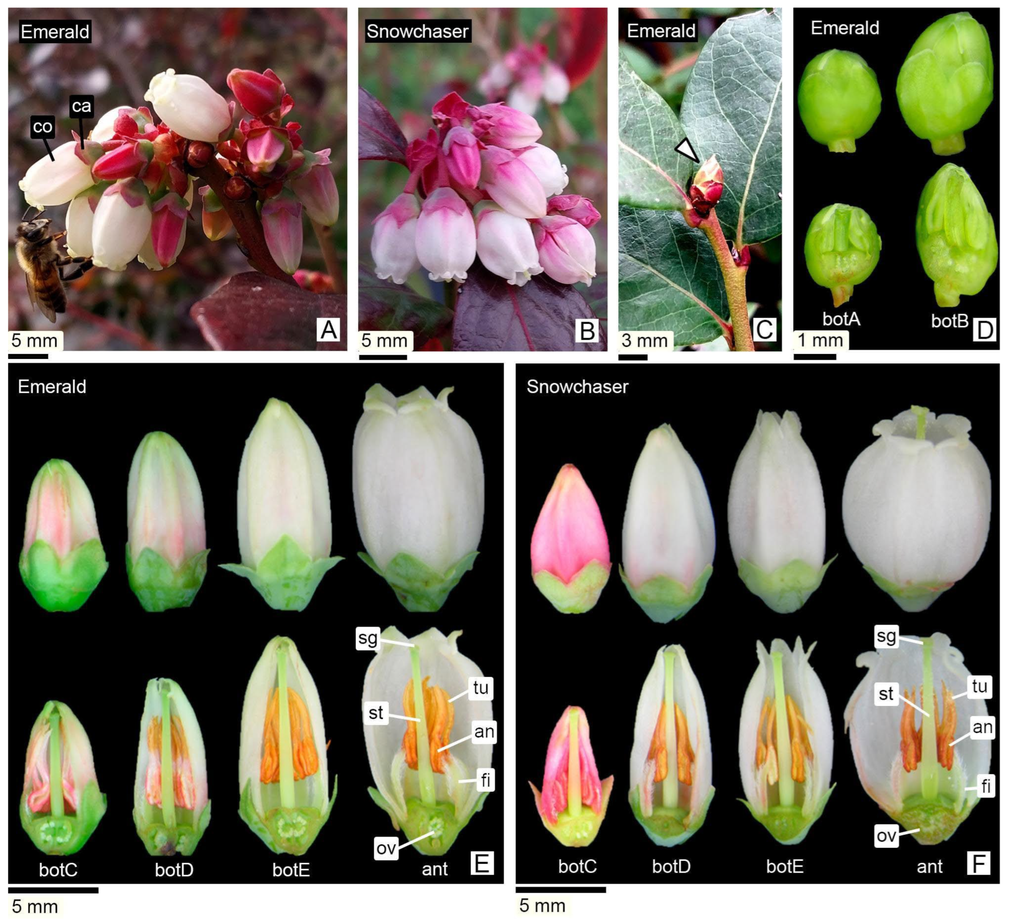 - Huang, Y.H.; Johnson, C.E.; Sundberg, M.D. Floral Morphology and Development of `Sharpblue’ Southern Highbush Blueberry in Louisiana. J. Am. Soc. Hortic. Sci. 1997, 122, 630–633. [Google Scholar] [CrossRef]