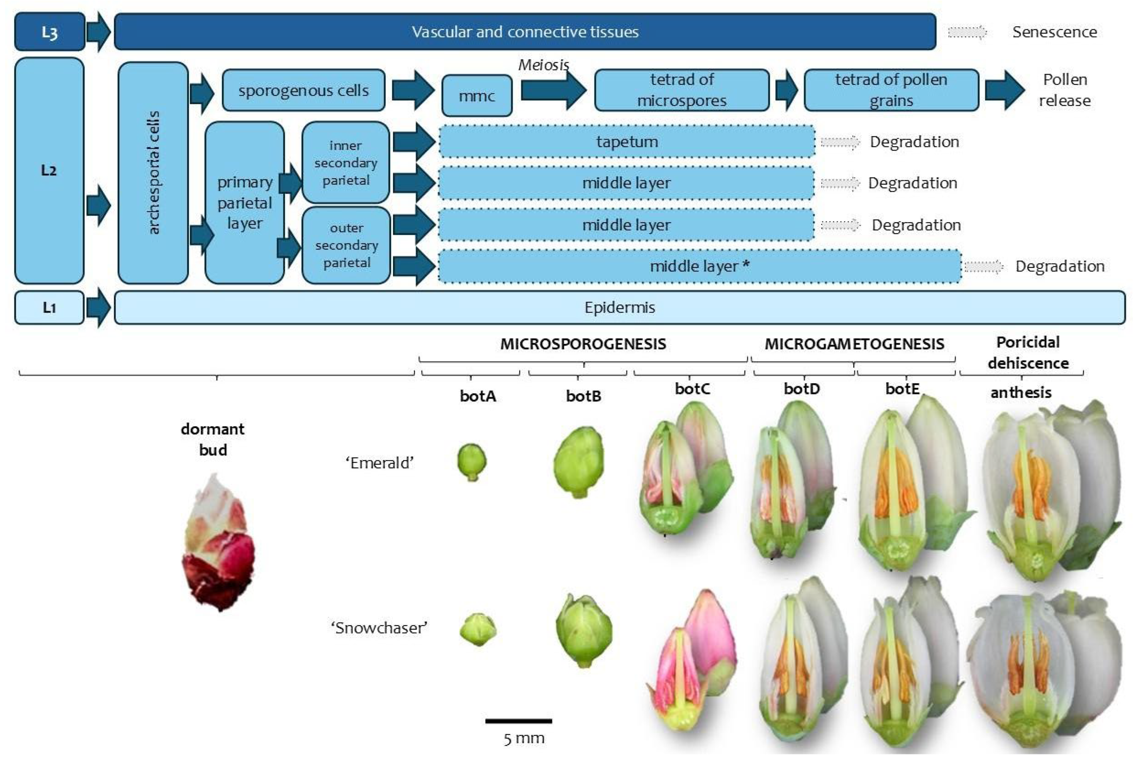 | botB | Bud break or bud burst. | 53 Inflorescence bud burst. Bud scales separated, lightened bud areas are visible. | Meiosis. | Locules expand, and internal cells become loosely arranged. Microspore mother cells undergo meiosis. Binucleate tapetum. | Epidermis, middle layers, tapetum, MMCs, connective tissue, vascular bundle. | Onset of central parenchyma degradation. Formation of apical slit. |