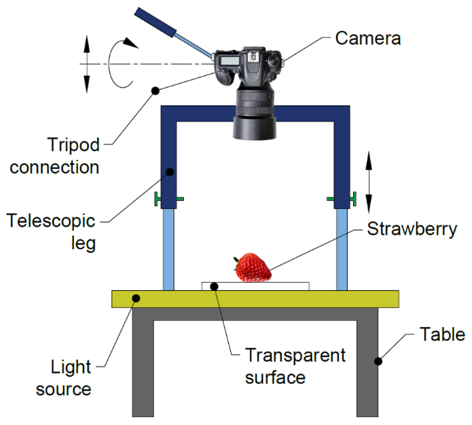 The images of the strawberry samples were obtained by means of a digital camera (the Panasonic Lumix DMC-FZ50, manufactured by Panasonic Corp., Osaka, Japan) that was equipped with a 1/1.8″ CCD sensor, which provided an effective resolution of 10.1 megapixels (maximum image size: 3648 × 2736 pixels). The lens employed in this study was the built-in LEICA DC VARIO-ELMARIT lens (Leica Camera AG, Wetzlar, Germany), which has a focal range of 7.4–88.8 mm (equivalent to 35–420 mm in the 35 mm format) and an aperture range of f/2.8–3.7. The lens was utilized at a fixed focal length of 35 mm with the objective of minimizing perspective distortion. The camera was mounted in a vertical orientation at a fixed height of 55 cm above a transparent fiberglass plate. This ensured that the optical axis was perpendicular, thus facilitating geometric consistency among all samples.