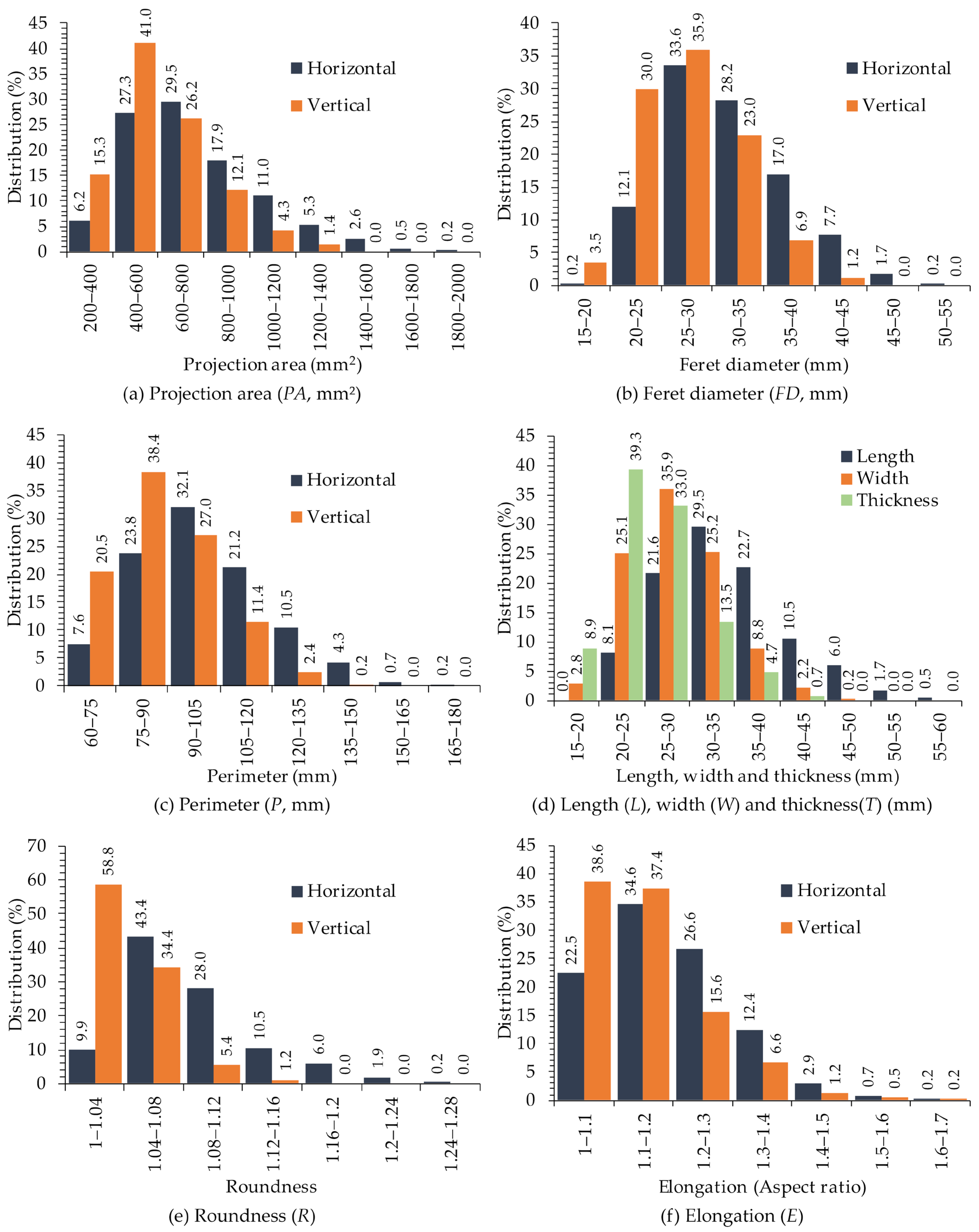 p < 0.01). The mean values for length and projected area obtained from horizontal measurements are greater than those obtained from vertical measurements. The increase in roundness and the width-to-length ratio in the horizontal plane indicates a decrease in roundness.