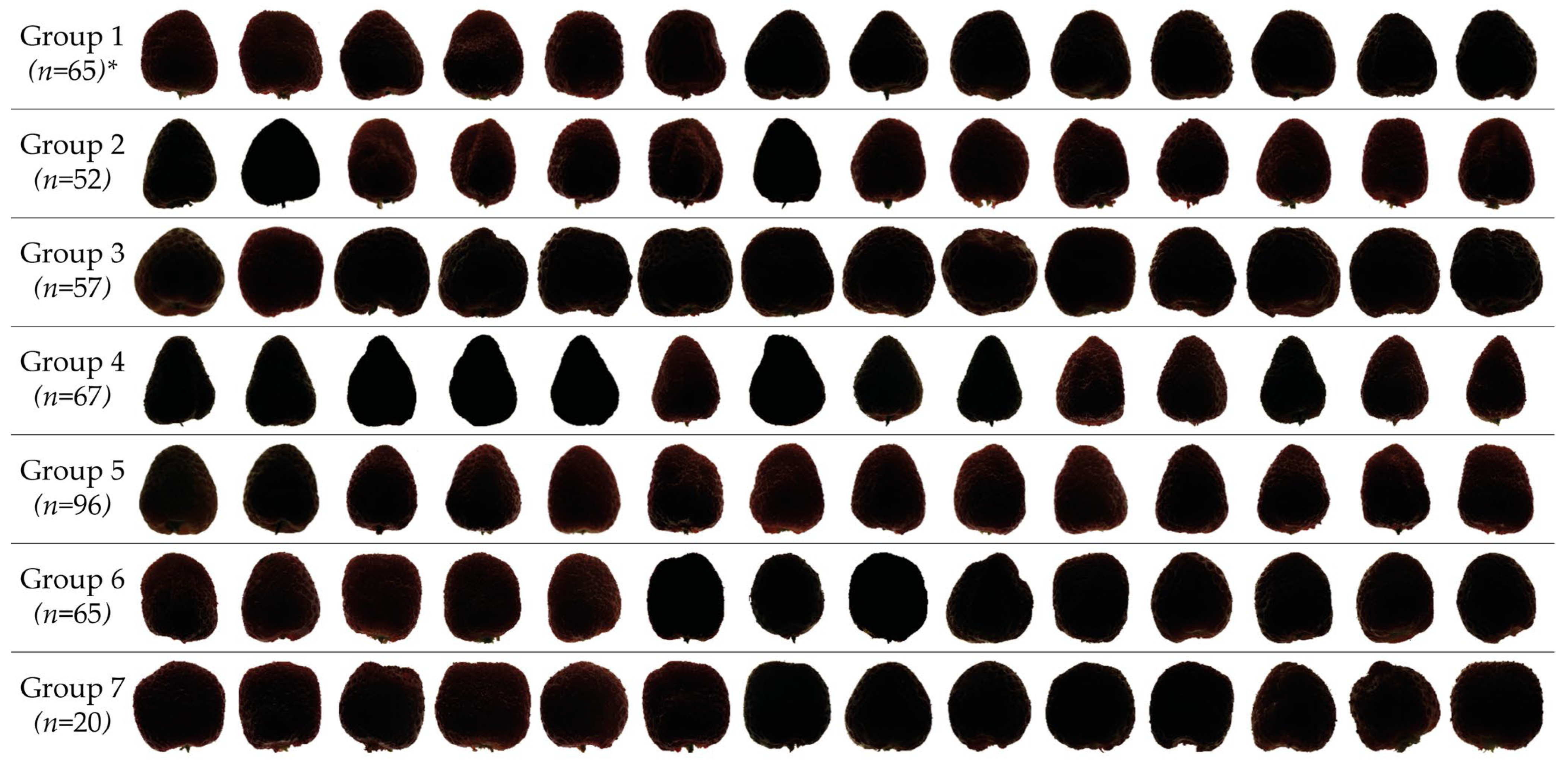 Figure 5, the k-means algorithm was utilized for the purpose of categorizing a set of strawberry images into seven distinct groups. It has been demonstrated that the images within each group exhibit notable similarities. Group 5 demonstrates a high degree of similarity in contour geometry, while Group 7 exhibits the least overlap with Group 5.