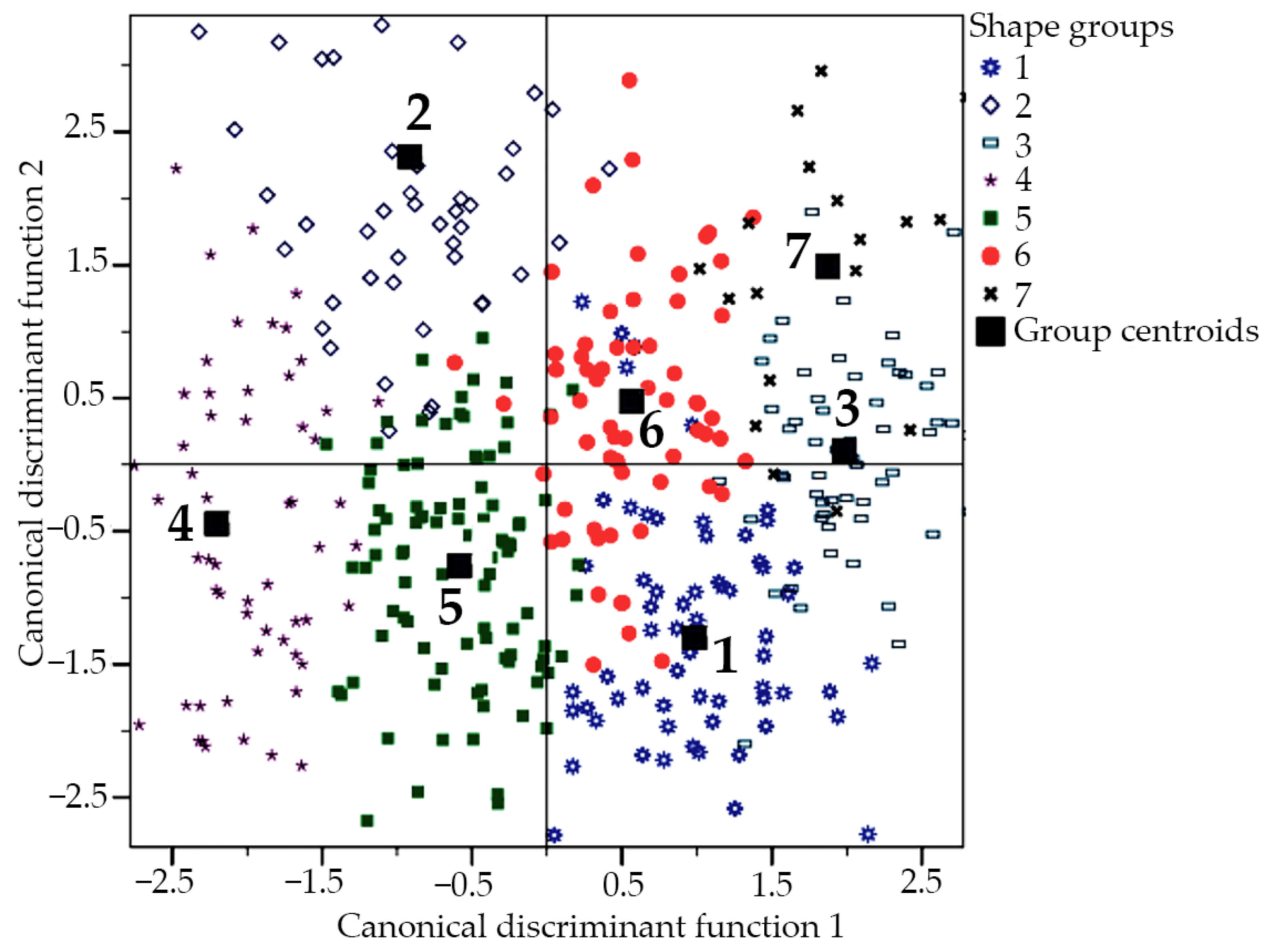 Figure 6, the differences between discriminant functions are evident when based on the central distribution between groups. The first two functions that emerge from canonical discrimination analysis have the capacity to explain a significant proportion of the variance, amounting to 89.0%. The central distributions, which are proximate to each other according to the horizontal and vertical axis sets, provide information about the distance of this separation, even though the strawberry samples are morphologically different. When examining the distances of the central distributions on the horizontal axis (Separation function 1), It has been demonstrated that the 3rd, 4th and 7th shape groups have distinctive features. In a similar manner, on the vertical axis (discriminant function 2), the observation that the samples in the 1st and 2nd groups are distant from the center indicates that they exhibit different shape characteristics.