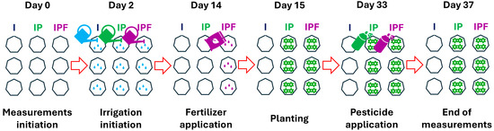 Chronological overview of experimental events, including initiation of measurements, irrigation, fertilizer and pesticide applications, planting, and termination of measurements. The three treatments were: irrigated soil only (I), irrigated soil with plants (IP), and irrigated soil with plants plus fertilizer (IPF), with three chambers assigned to each treatment.