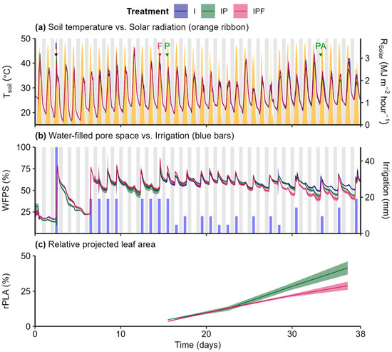 Instantaneous soil temperature (a), instantaneous water-filled pore space (b), and relative projected leaf area (c) derived from soils (non- or vegetated) in the “I” (Irrigation), “IP” (Irrigation + Plants), and “IPF” (Irrigation + Plants + Fertilizer) treatments. Lines represent the medians (±standard error for the median estimated using bootstrap (B = 999), n = 3). Arrows in plot a indicate when a significant event took place, with the letters “I”, “F”, “P”, and “PA” meaning, respectively, “Irrigation”, “Fertilizer”, “Planting”, and “Pesticide Application”. Grey bars represent the night period, white bars represent the day period, yellow ribbon represents the solar radiation (a) and blue bars the irrigation (b).