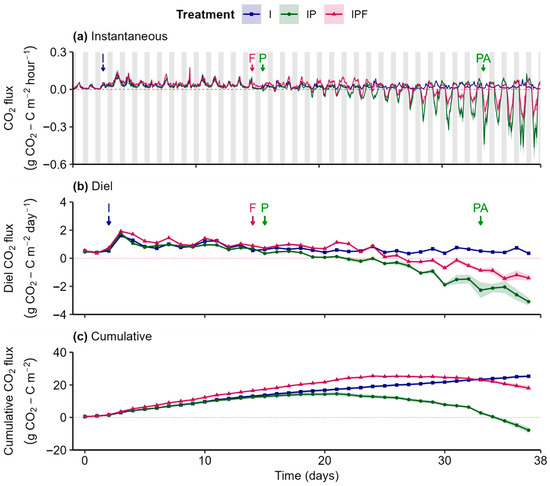 As a result of the observed instantaneous fluxes, the IP treatment exhibited significantly different diel CO2 fluxes compared to the I treatment from days 18 to 37 (Figure S4(a.1)), driven by a shift from diel (net) effluxes to influxes (Figure 3b). In contrast, diel CO2 effluxes in the IPF treatment were significantly larger than those in the I treatment between days 16 to 22 (Figure S4(a.2)). However, as plant development progressed, CO2 uptake gradually became dominant in IPF treatment as well (Figure 3b,c). From days 27 to 38, the IPF treatment again diverged significantly from the I treatment, but now due to an increasing influx. Despite this shift, IPF consistently exhibited smaller diel CO2 influxes than IP throughout the post-planting period.