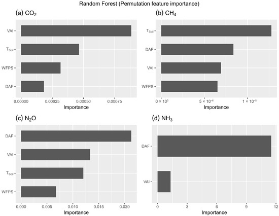 Permutation-based feature importance for greenhouse gas fluxes derived from random forest analysis. Barplots illustrate the feature importance of predictors for CO2 (a), CH4 (b), N2O (c) and NH3 (d). VAI = Vegetation Activity Index, Tsoil = Soil temperature, WFPS = Water-filled pore space, DAF = Days after fertilization.