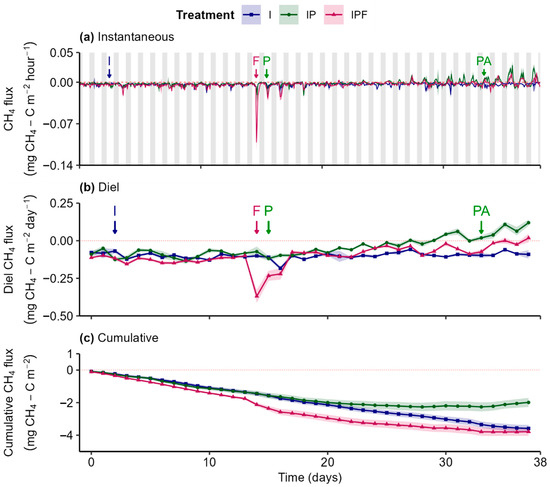 Instantaneous (a), diel (24 h; (b)), and cumulative (c) CH4 fluxes from soils with different treatments: “I” = Irrigation, “IP” = Irrigation + Plants, and “IPF” = Irrigation + Plants + Fertilizer. Lines represent the gas flux, with shaded ribbons showing the standard error of the median estimated using bootstrap (B = 999, n = 3). Arrows mark key events: “I” = Irrigation, “F” = Fertilizer, “P” = Planting, and “PA” = Pesticide Application. Grey bars represent the night period, and white bars represent the day period.