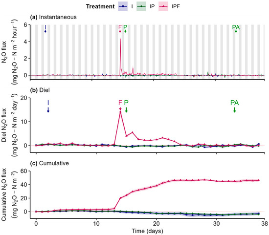 Instantaneous (a), diel (24 h; (b)), and cumulative (c) N2O fluxes from soils with different treatments: “I” = Irrigation, “IP” = Irrigation + Plants, and “IPF” = Irrigation + Plants + Fertilizer. Lines represent the gas flux medians, with shaded ribbons showing the standard error of the median estimated using bootstrap (B = 999, n = 3). Arrows mark key events: “I” = Irrigation, “F” = Fertilizer, “P” = Planting, and “PA” = Pesticide Application. Grey bars represent the night period, and white bars represent the day period.