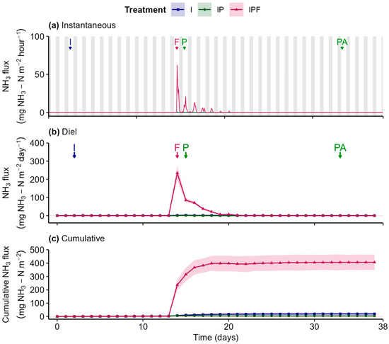 On the day prior to fertilizer application (day 13), NH3 diel efflux in the IPF treatment was significantly smaller compared to both the I and IP treatments (Figure S4(d.2,d.3)). Following fertilizer application on day 14, NH3 diel efflux in the IPF treatment increased substantially (Figure 7b,c) resulting in significant differences compared to the other two treatments from days 14 to 19 (Figure S4(d.2,d.3)). Similarly to N2O, no significant differences in NH3 diel fluxes were detected between the I and IP treatments throughout the experiment (Figure S4(d.1)).