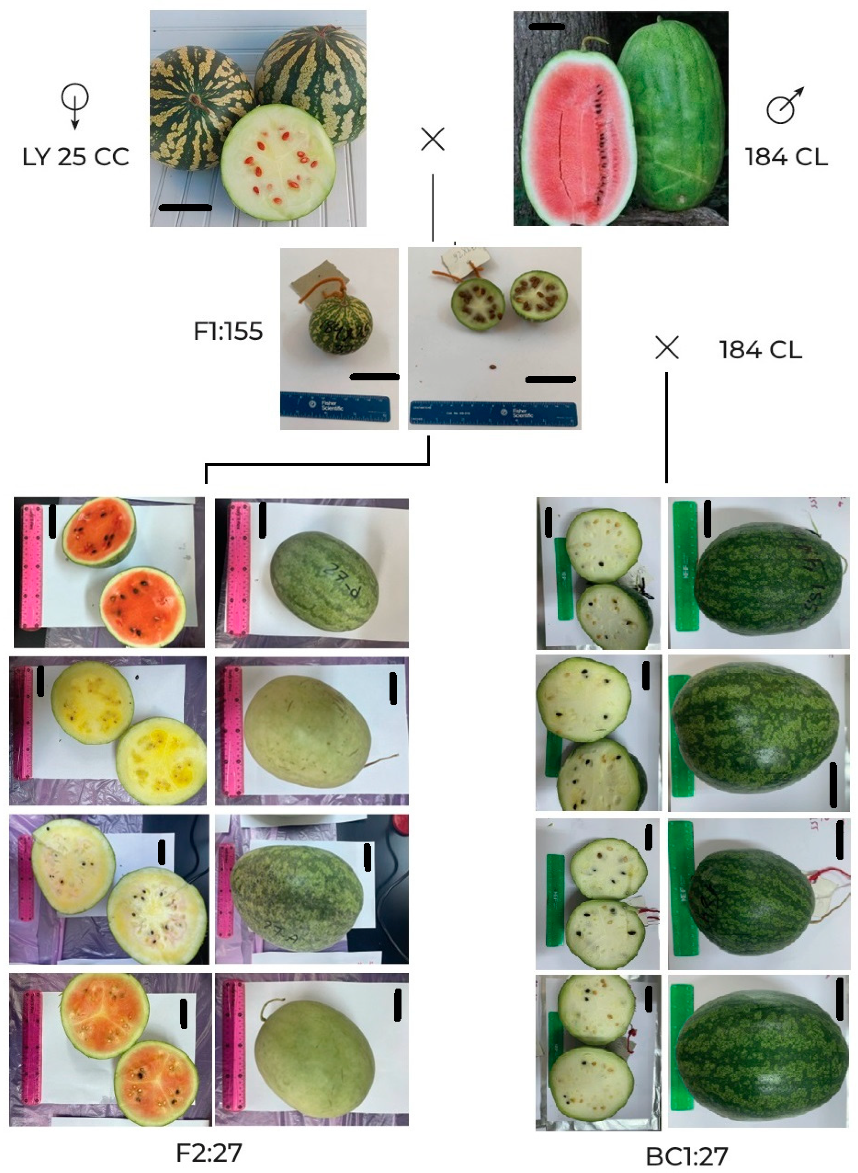 - Levi, A.; Wechter, P.; Massey, L.; Carter, L.; Hopkins, D. An extended genetic linkage map for watermelon based on a testcross and a BC 2 F 2 population. Am. J. Plant Sci. 2011, 2, 93. [Google Scholar] [CrossRef]