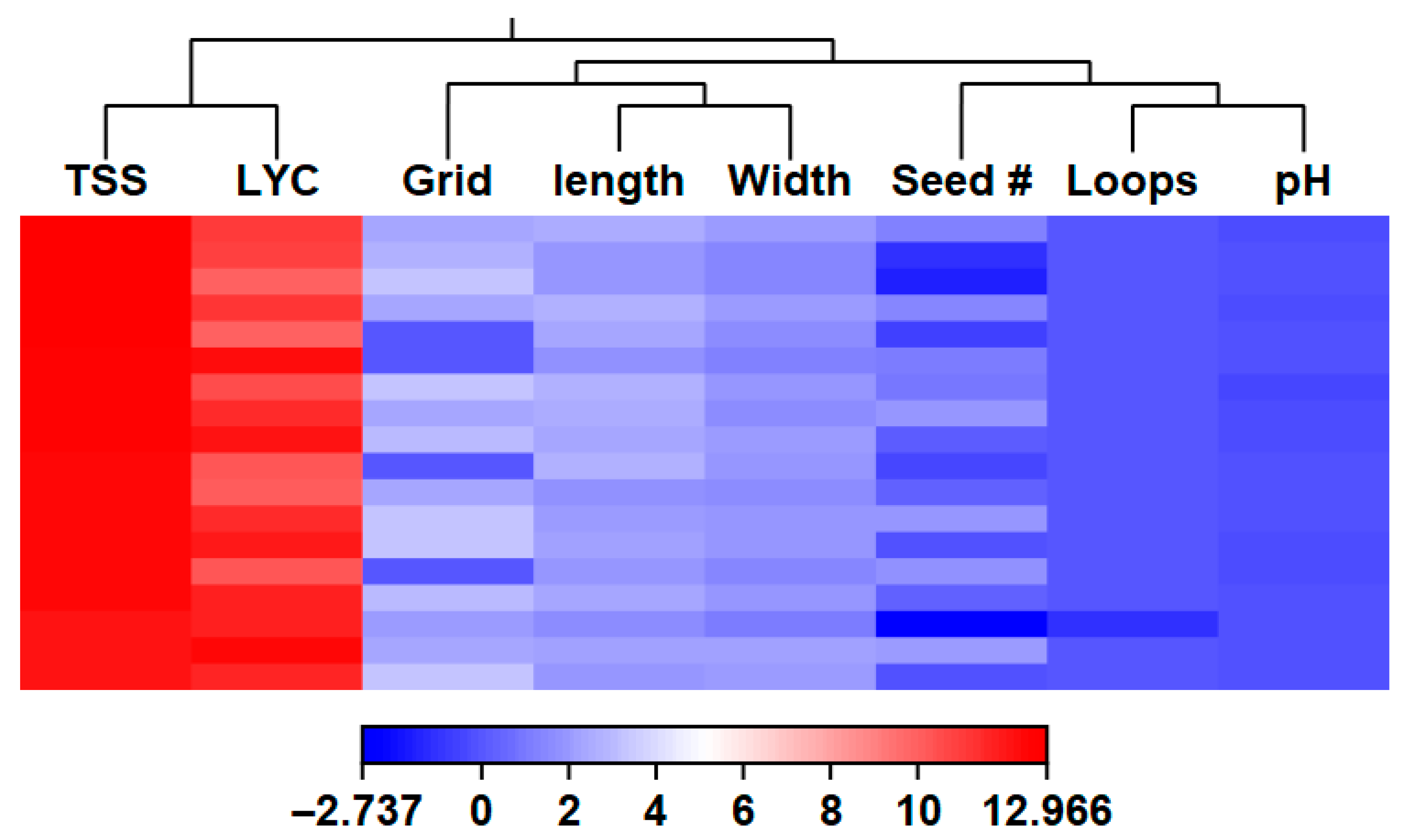 - Maragal, S.; Rao, E.S.; Lakshmana Reddy, D.C. Genetic analysis of fruit quality traits in prebred lines of watermelon derived from a wild accession of Citrullus amarus. Euphytica 2019, 215, 199. [Google Scholar] [CrossRef]