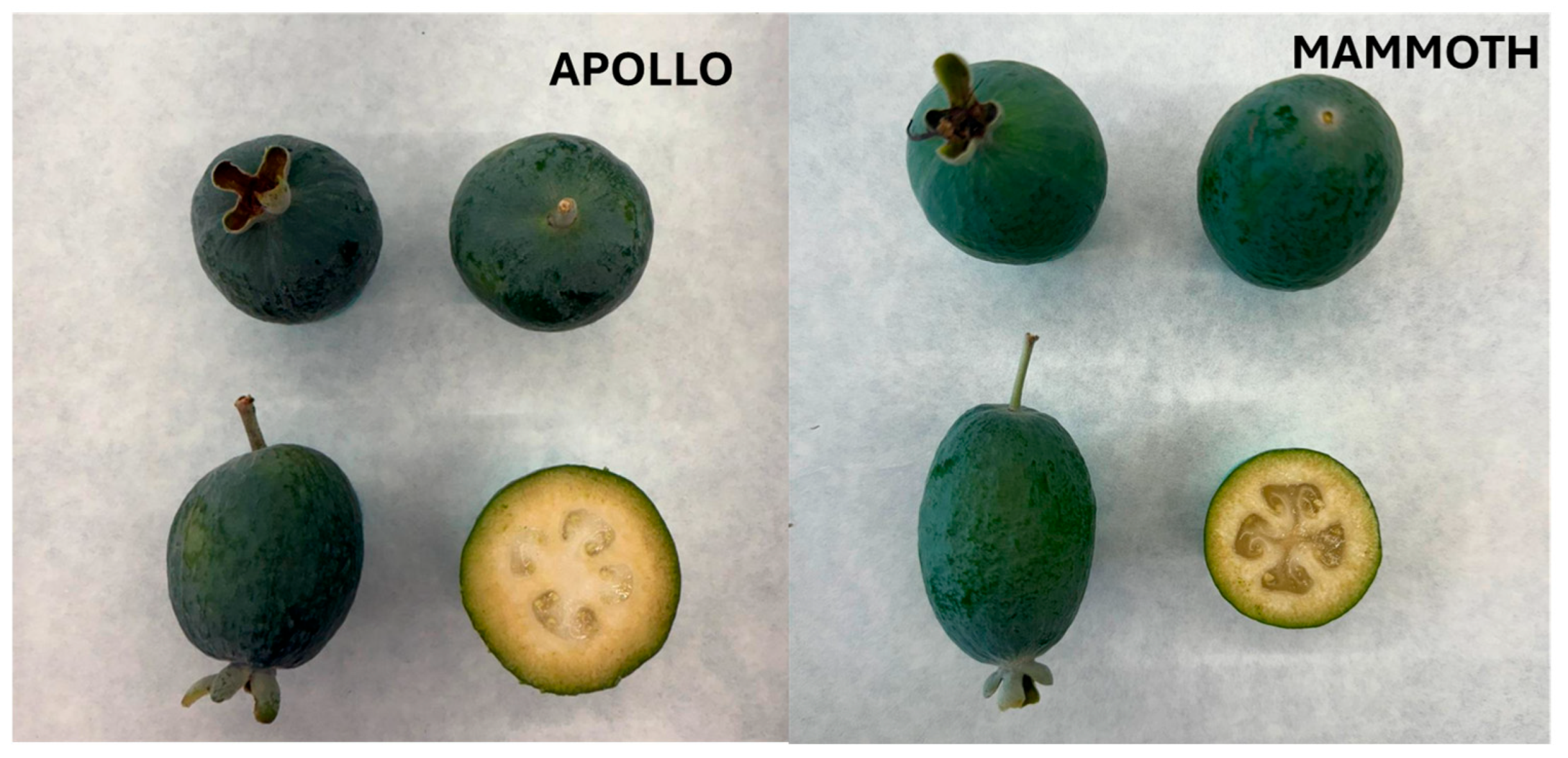 - Schotsmans, W.C.; East, A.; Thorp, G.; Woolf, A.B. Feijoa (Acca sellowiana [Berg] Burret). In Postharvest Biology and Technology of Tropical and Subtropical Fruits; Elsevier: Amsterdam, The Netherlands, 2011; pp. 115–133, 115e–135e. ISBN 978-1-84569-735-8. [Google Scholar]