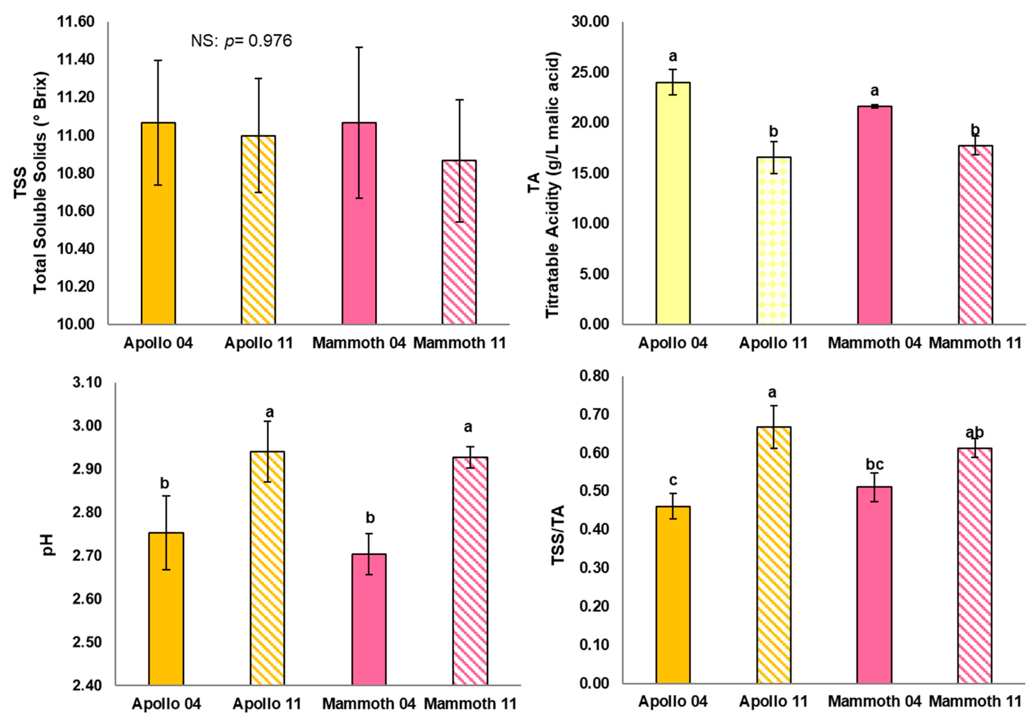 | Mammoth 04 | 73.67 ± 8.49 b | 64.52 ± 4.40 a | 47.98 ± 2.05 b | 3.95 ± 2.27 c |