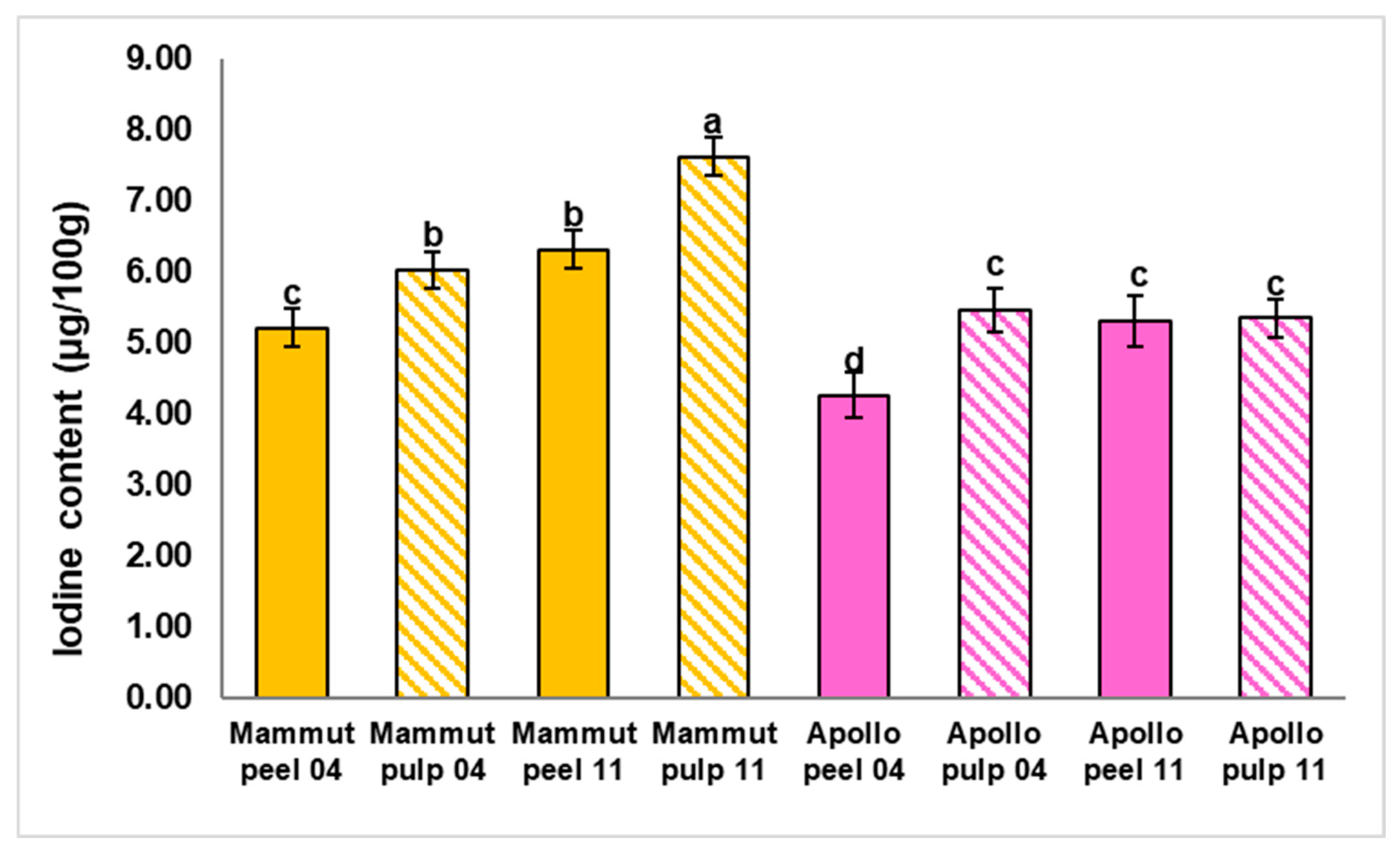 - Budke, C.; Dierend, W.; Schön, H.-G.; Hora, K.; Mühling, K.H.; Daum, D. Iodine Biofortification of Apples and Pears in an Orchard Using Foliar Sprays of Different Composition. Front. Plant Sci. 2021, 12, 638671. [Google Scholar] [CrossRef] [PubMed]