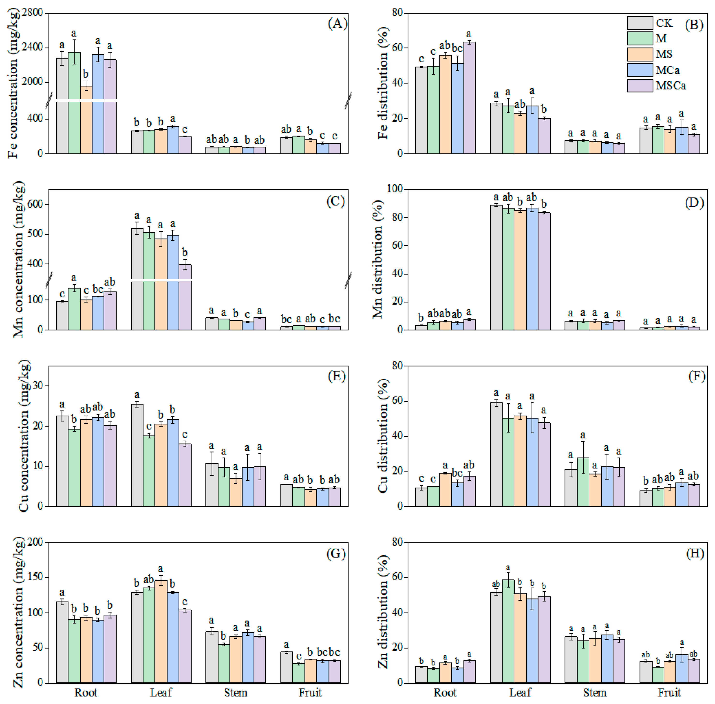 3.4. Concentration and Distribution of Micronutrients in Tomato Organs
