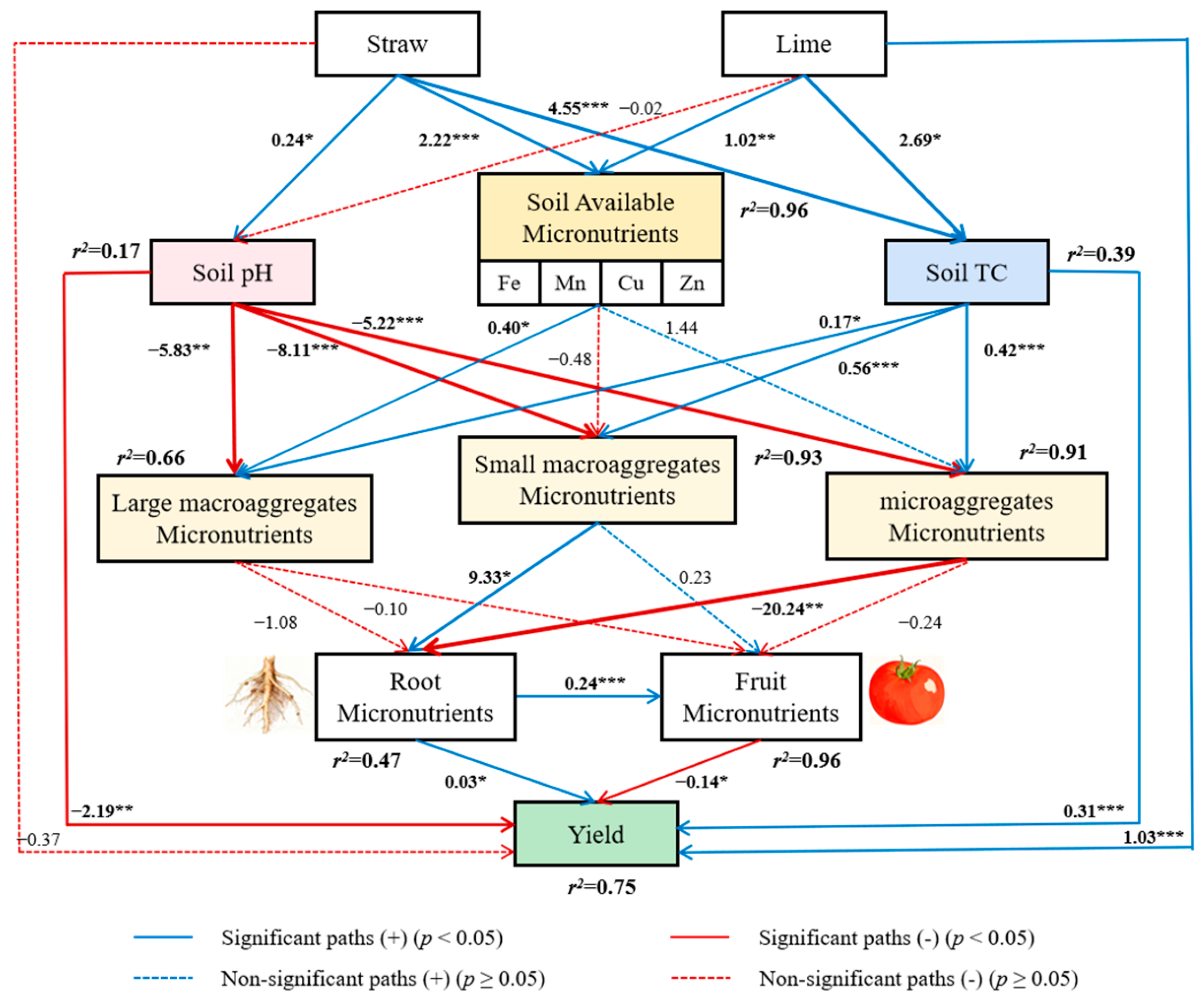 3.6. Pathways of Straw and Lime Application in Regulating Tomato Yield