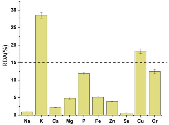 According to EFSA dietary reference values for selected minerals are as follows: potassium—3500 mg/day, phosphorus—550 mg/day, magnesium—375 mg/day, calcium—1000 mg/day, iron—14 mg/day, zinc—10 mg/day, and copper—1 mg/day. In relation to dietary recommendations, an intake of 200 mL of goji berry juice provides more than 15% of the Recommended Daily Allowance (RDA) for potassium and copper, highlighting its value as a valuable dietary source of these essential minerals. To facilitate a clearer nutritional interpretation, the contributions of the analyzed minerals to RDA values were presented graphically in Figure 1.