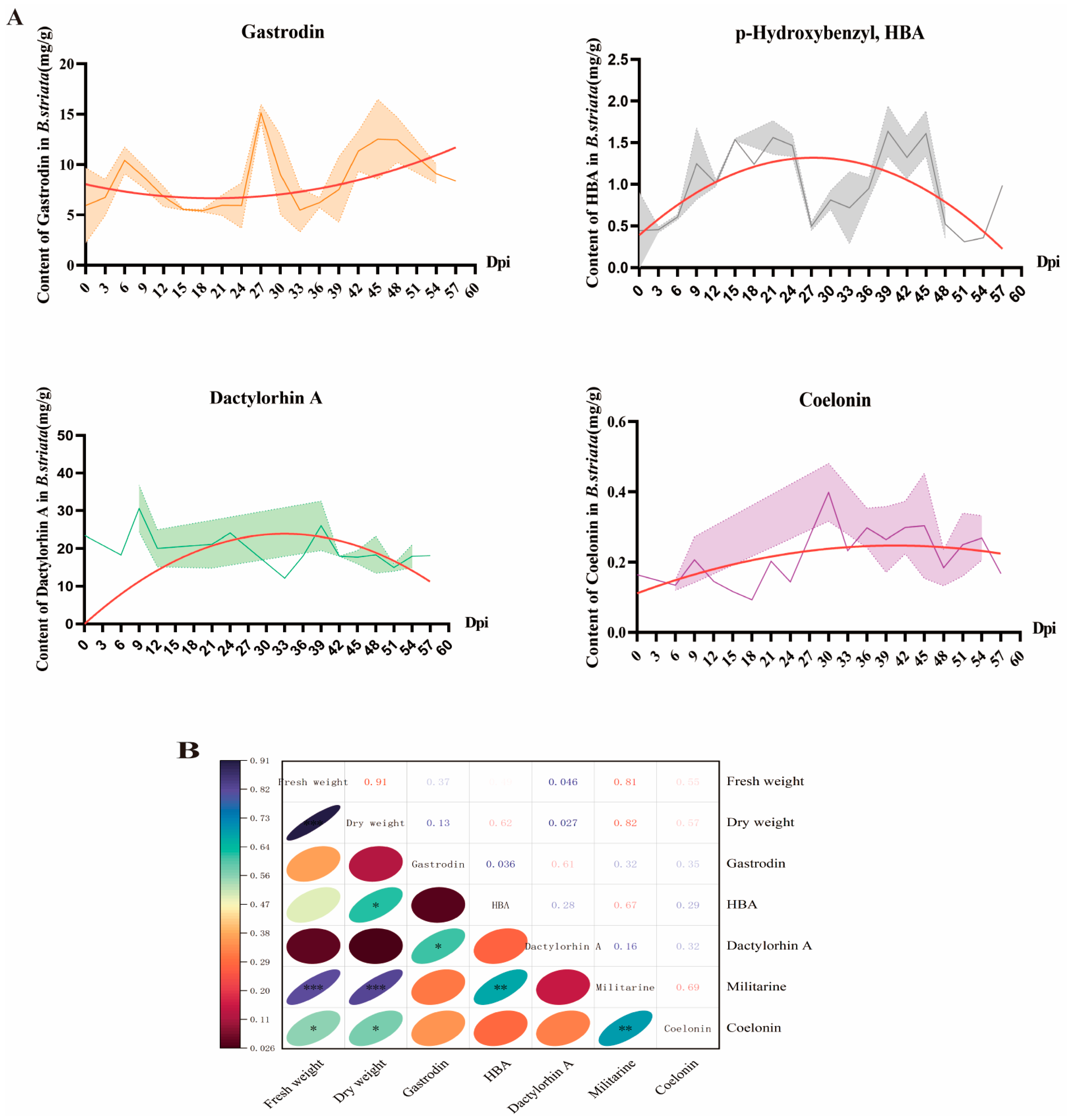- Xu, S.; Zhang, Y.; Liang, F.; Jiang, S.; Niu, S.; Wang, X.; Zhou, Y.; Cui, B.; Yuan, X. Metabolomic and transcriptomic analyses reveal the mechanism of polysaccharide and secondary metabolite biosynthesis in Bletilla striata tubers in response to shading. Int. J. Biol. Macromol. 2024, 279 Pt 4, 135545. [Google Scholar] [CrossRef] [PubMed]
