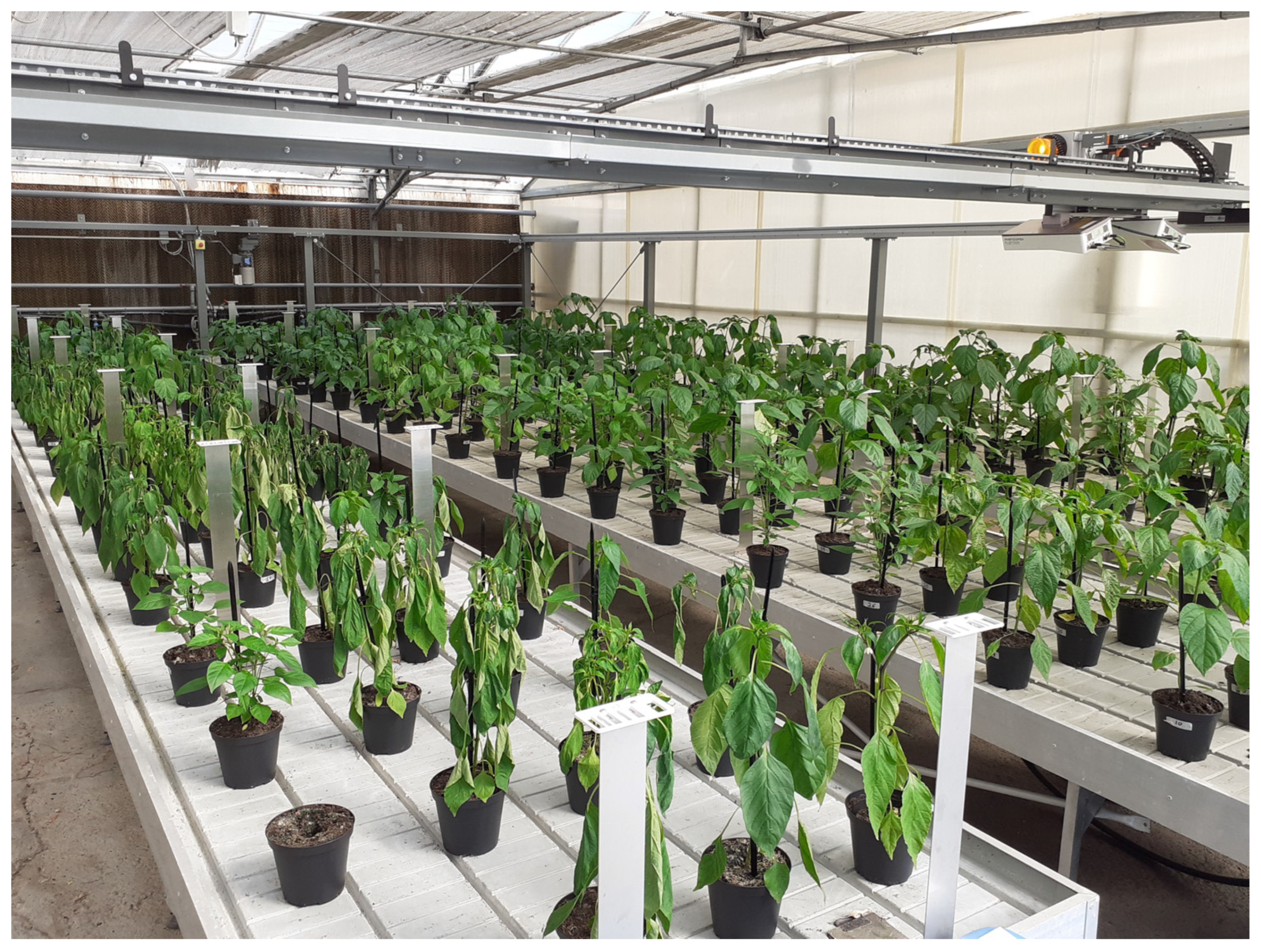 - Ntanasi, T.; Karavidas, I.; Savvas, D.; Spyrou, G.P.; Giannothanasis, E.; Consentino, B.B.; Papasotiropoulos, V.; Sabatino, L.; Ntatsi, G. Physiological and Yield Responses of Pepper (Capsicum annuum L.) Genotypes to Drought Stress. Plants 2025, 14, 1934. [Google Scholar] [CrossRef]