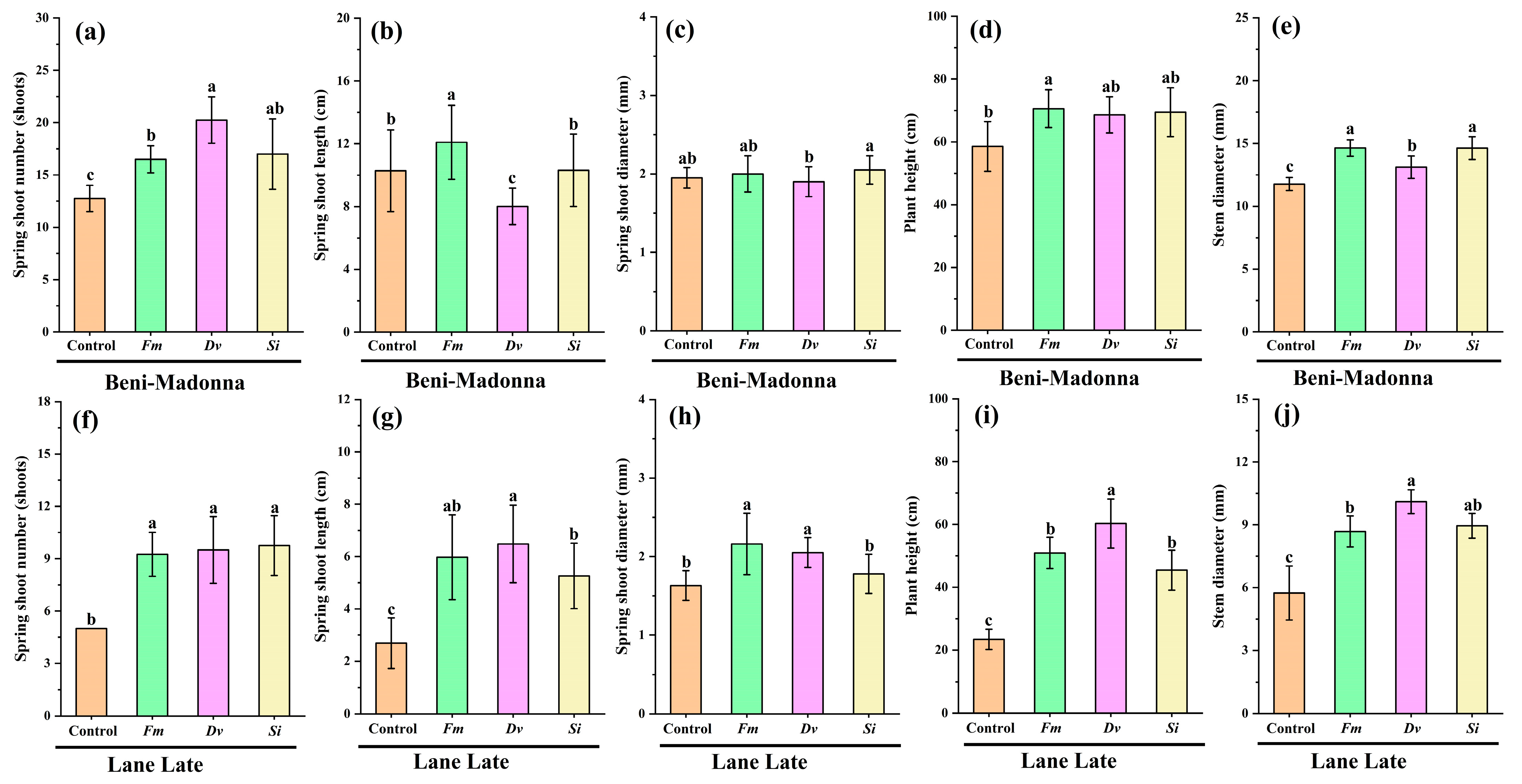 3.2. Effects of Fungal Inoculation on Spring Shoot Growth and Growth Performance of Citrus