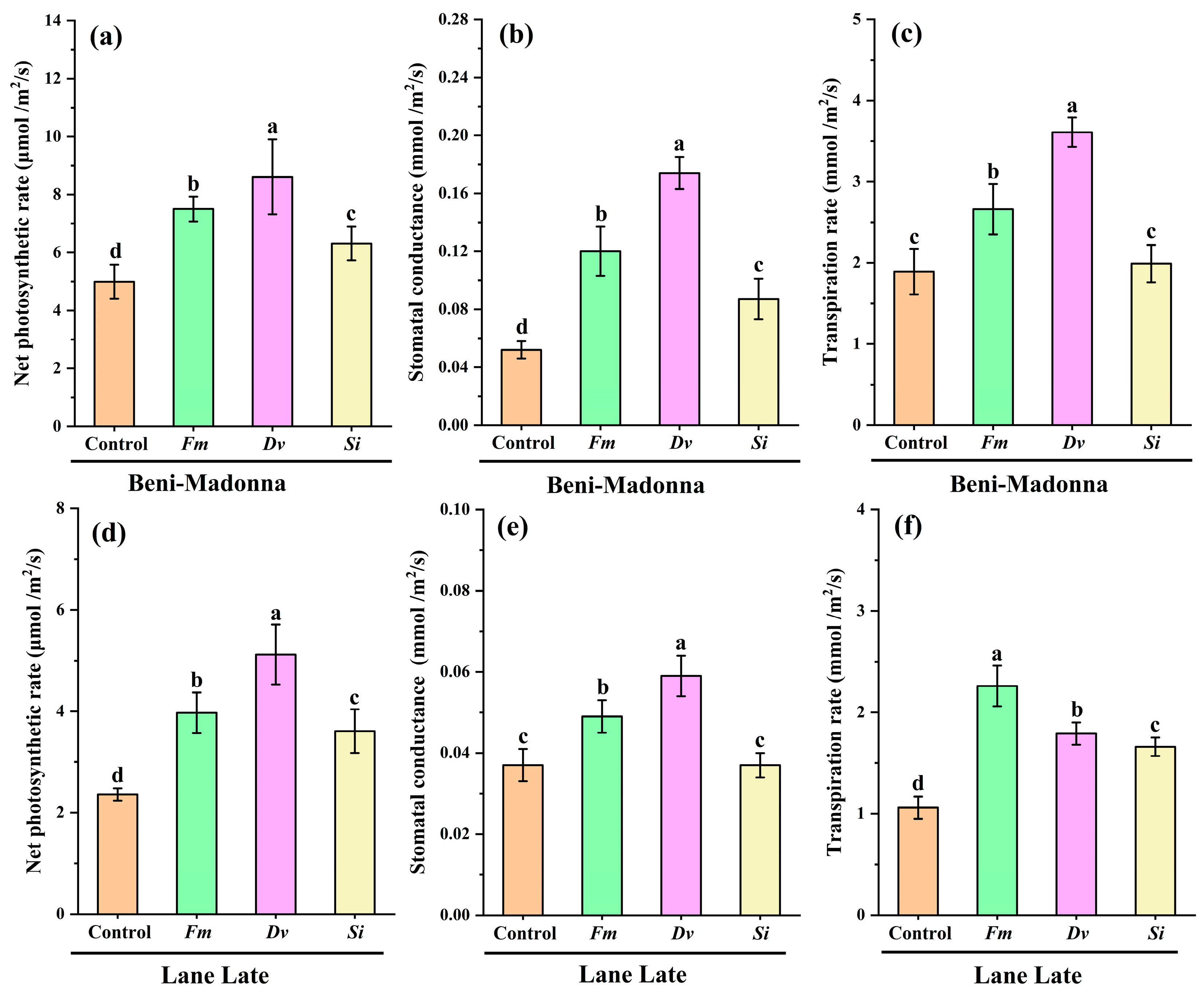 3.3. Effects of Fungal Inoculation on Leaf Gas Exchange Parameters of Citrus