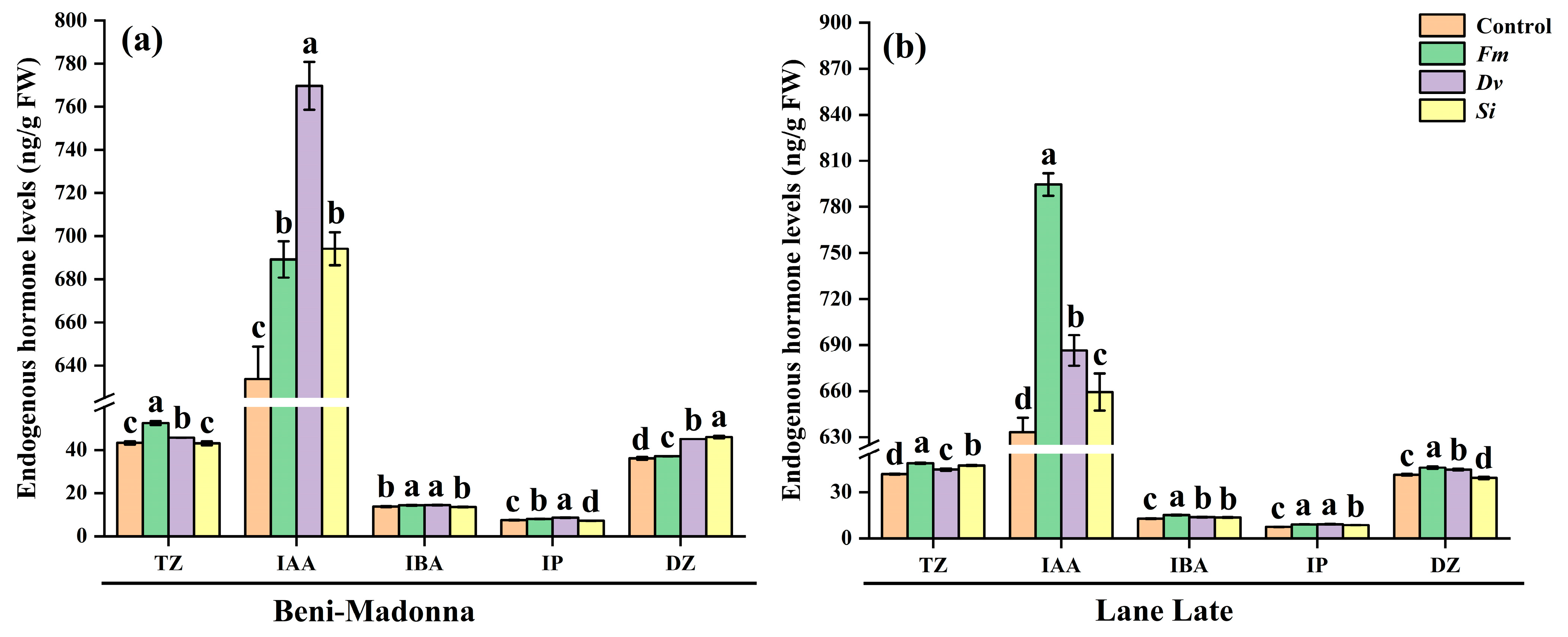 3.4. Effects of Fungal Inoculation on Leaf Endogenous Hormone Levels of Citrus