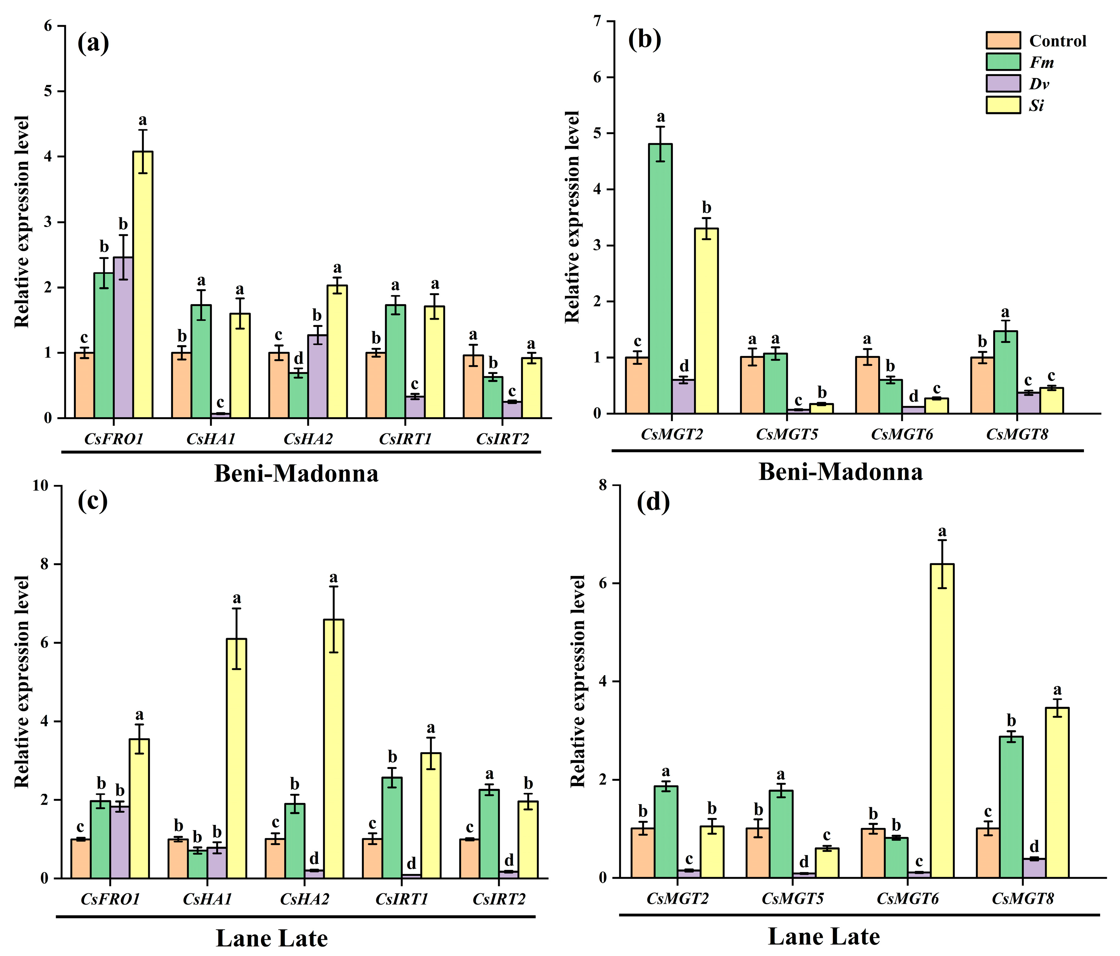 3.6. Effects of Fungal Inoculation on the Expression of Leaf Fe/Mg Transporter Genes of Citrus