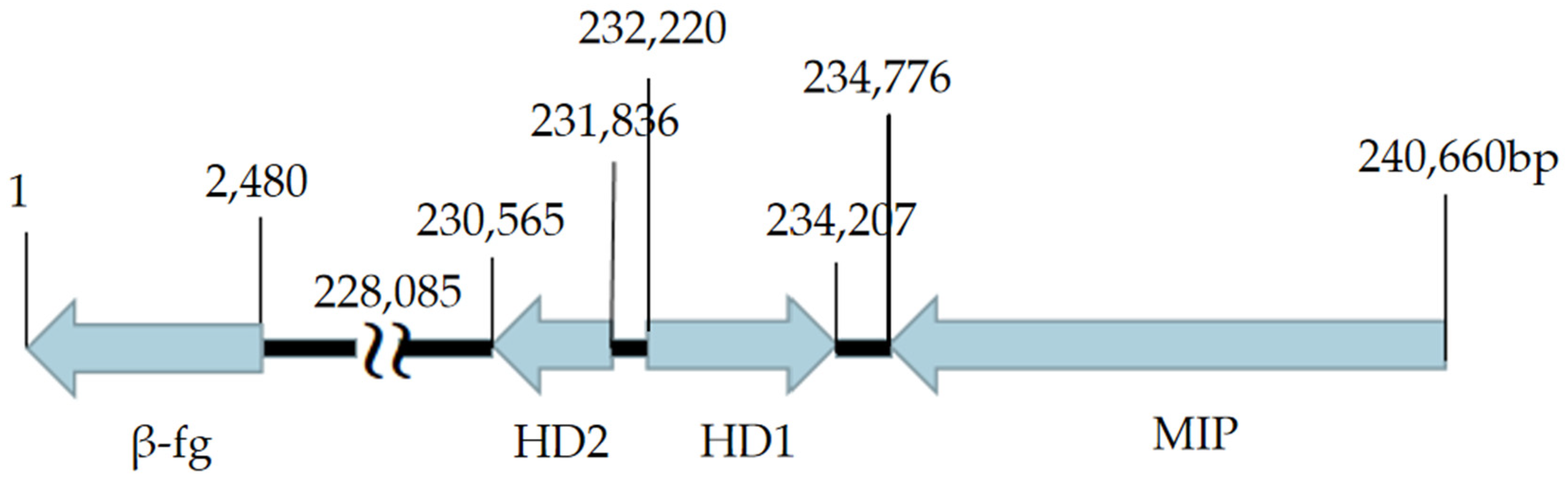 - Majoros, W.H.; Pertea, M.; Salzberg, S.L. Tigrscan and glimmer HMM: Two open source ab initio eukaryotic gene-finders. Bioinformatics 2004, 20, 2878–2879. [Google Scholar] [CrossRef] [PubMed]