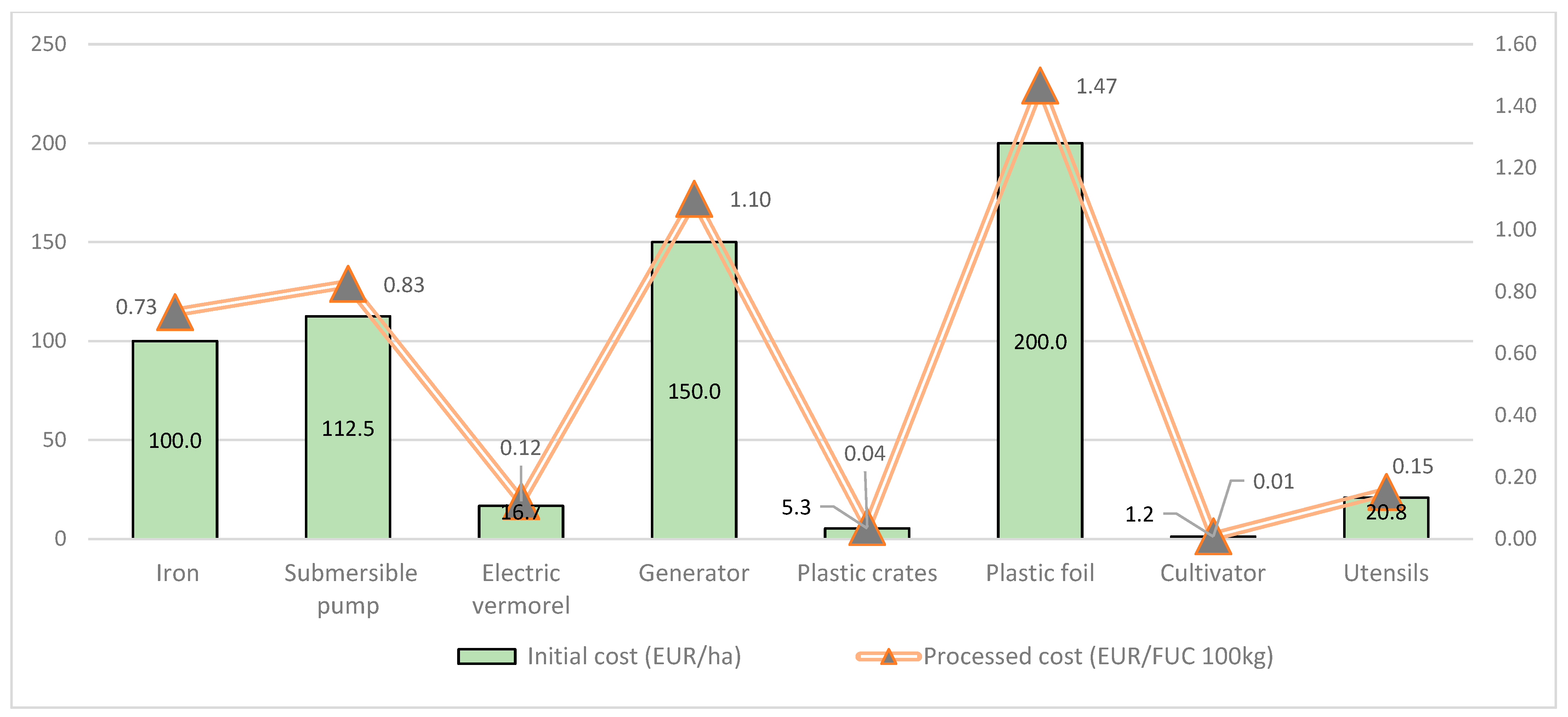 | Producing Material | Initial Costs (EUR/ha) | Processed Costs (EUR/FUC 100 kg) |