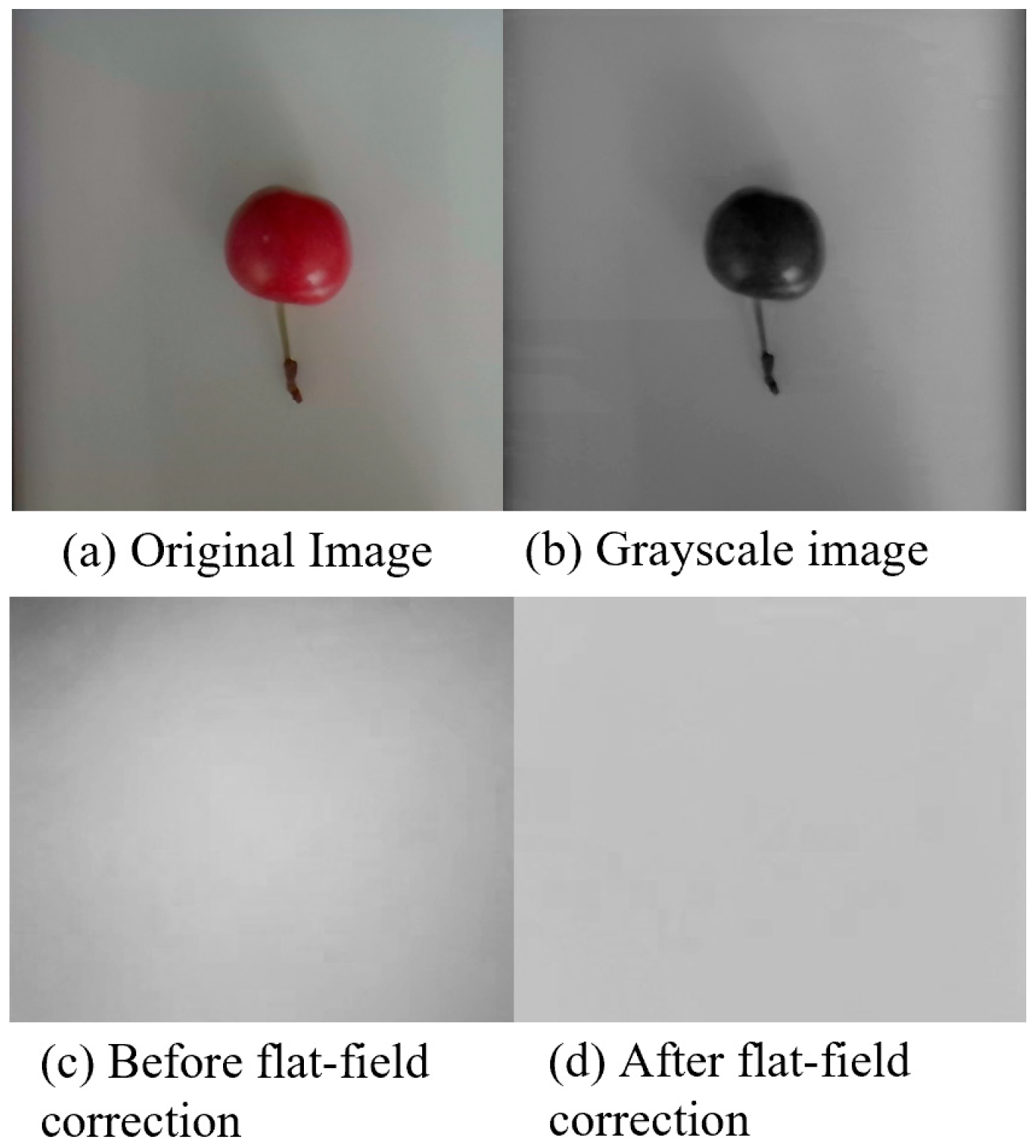 Figure 1, where (a) is the original RGB image, (b) is the grayscale image after weighted average processing, (c) is the image before flat-field correction (with obvious edge darkening), and (d) is the image after correction (with uniform brightness).