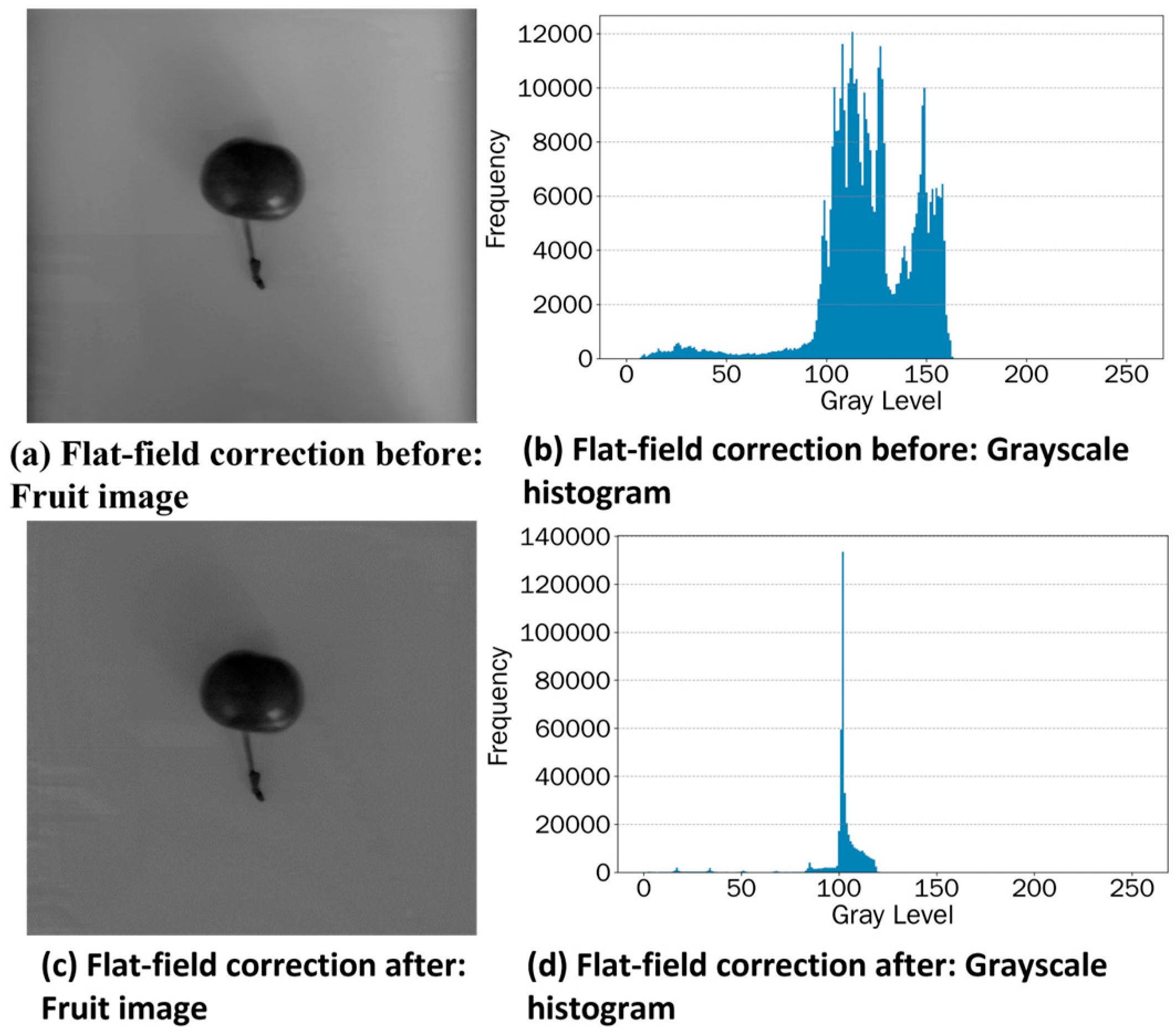 The visual effects of grayscale conversion and flat-field correction are shown in