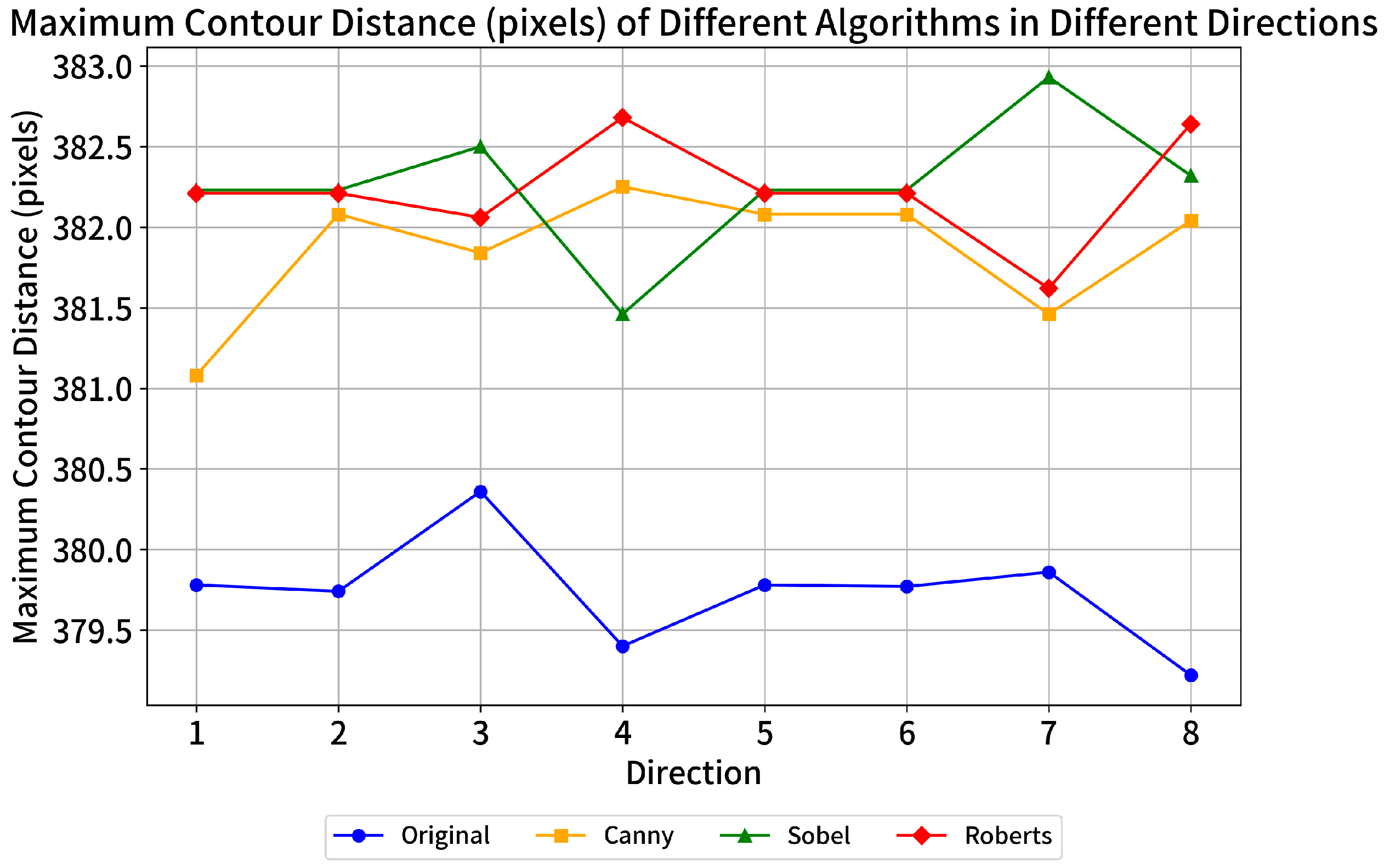 To identify the most suitable edge detection algorithm for this experiment, the commonly used algorithms Canny, Sobel, and Roberts were tested to determine the optimal choice. A circular image was used as the original image. To simulate an actual detection environment, a 5 × 5 convolution kernel was applied to create a blurred version. Contours were then extracted from the blurred images using the Canny, Sobel, and Roberts algorithms. The maximum contour distance in eight directions was measured for each contour-extracted image, and the results are shown in