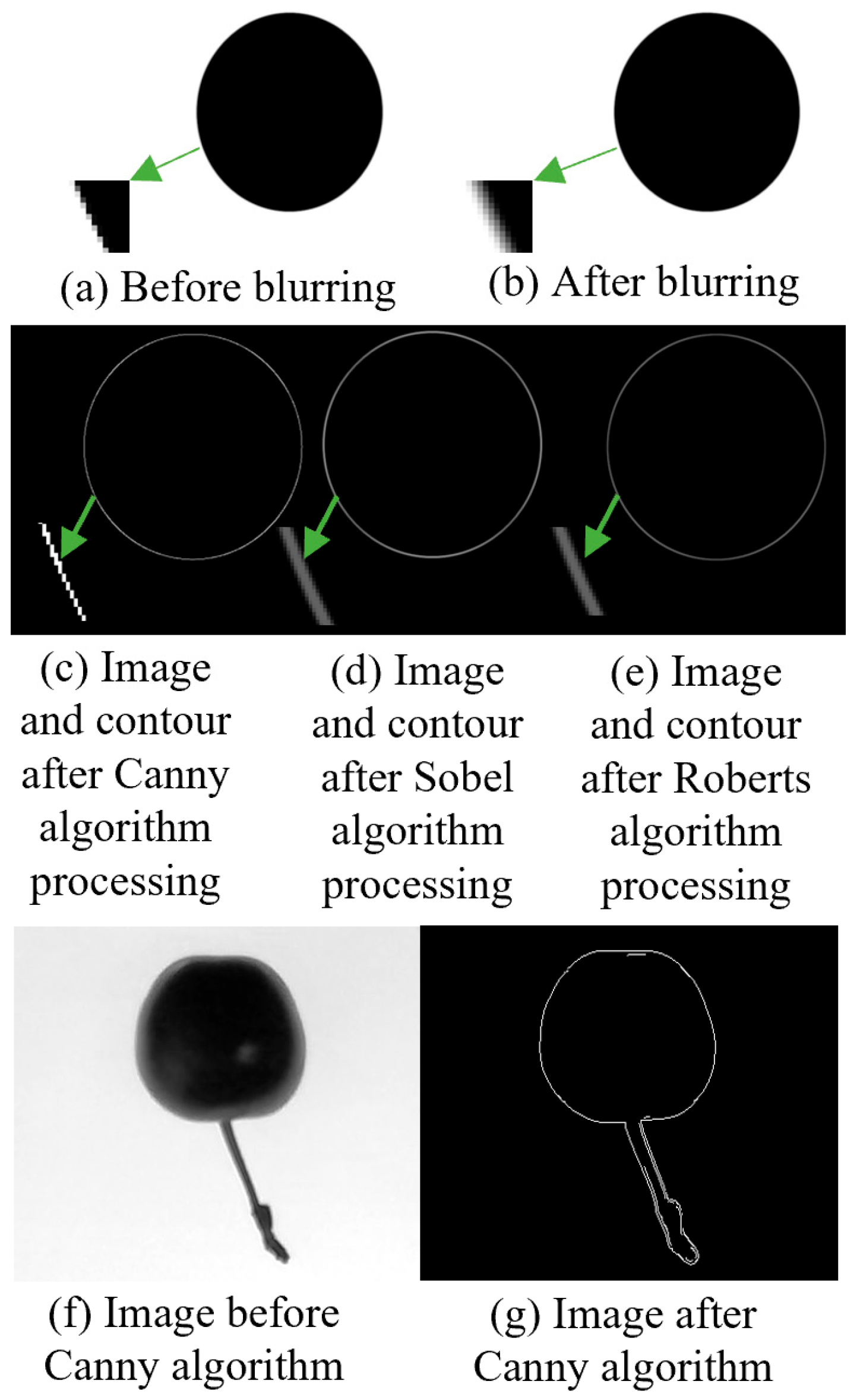 Figure 4 further confirms this result: (a) and (b) show the original and blurred circular images (simulating real fruit edge ambiguity), while (c)–(e) present the contour extraction effects of Canny, Sobel, and Roberts algorithms, respectively. It is clear that the Canny algorithm retains the most complete and accurate contour, with minimal deviation from the original circular shape, whereas Sobel and Roberts algorithms produce fragmented or offset edges. (f) and (g) additionally show the Canny processing results for actual cherry images, verifying its applicability to real samples.