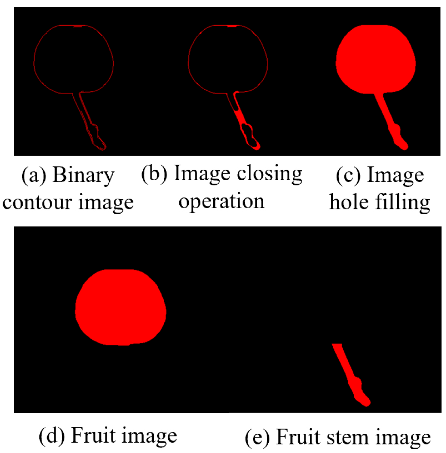 Figure 5b,c. In the opening operation, which consists of erosion followed by dilation, narrow connections between the fruit and stem are first removed by erosion, since the stem is thinner and therefore entirely eliminated at this stage. Dilation then restores the fruit contour to its original dimensions, effectively isolating the fruit from the stem.
