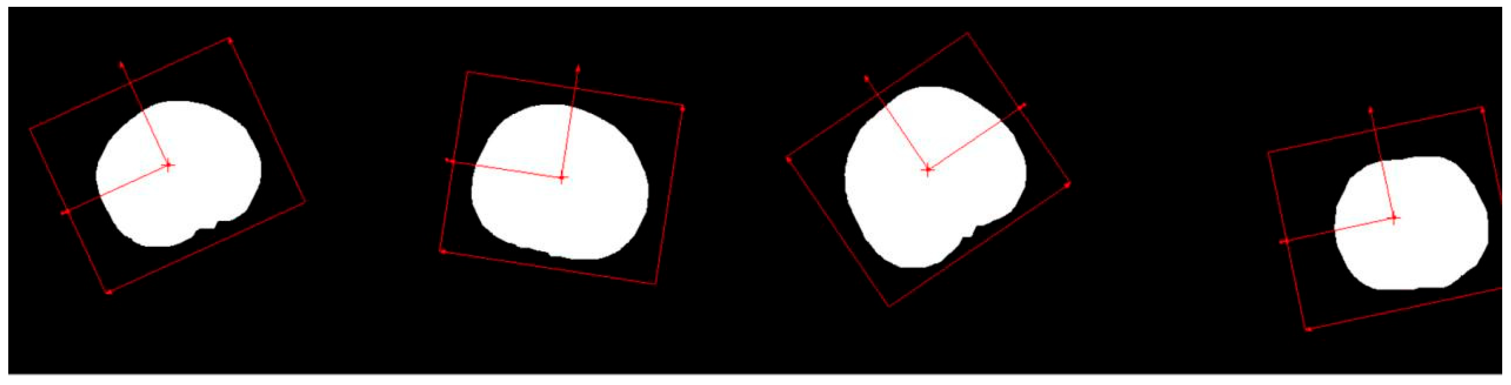 Before performing size measurements, it is essential to determine the position and orientation of the cherry fruit in the 2D plane and establish a coordinate system based on its location and orientation to measure the transverse diameter of the cherry. This can be achieved using a geometric matching algorithm that identifies the position and orientation by learning the geometric features of the provided template and the spatial relationships between these features. These combined features form a set that describes the image, and the algorithm performs feature matching with the detected image using this set. In this study, an edge-based geometric matching algorithm was applied to calculate the gradient values of the edges, which were points along the contour found in the image. The algorithm then used these gradient values and point positions to perform matching from the template center. As the cherry image was previously segmented from the background, the current image was free from environmental interference. To increase the robustness, the matching score can be lowered by setting the parameters, allowing for a greater tolerance of different cherry shapes. The matching results are shown in