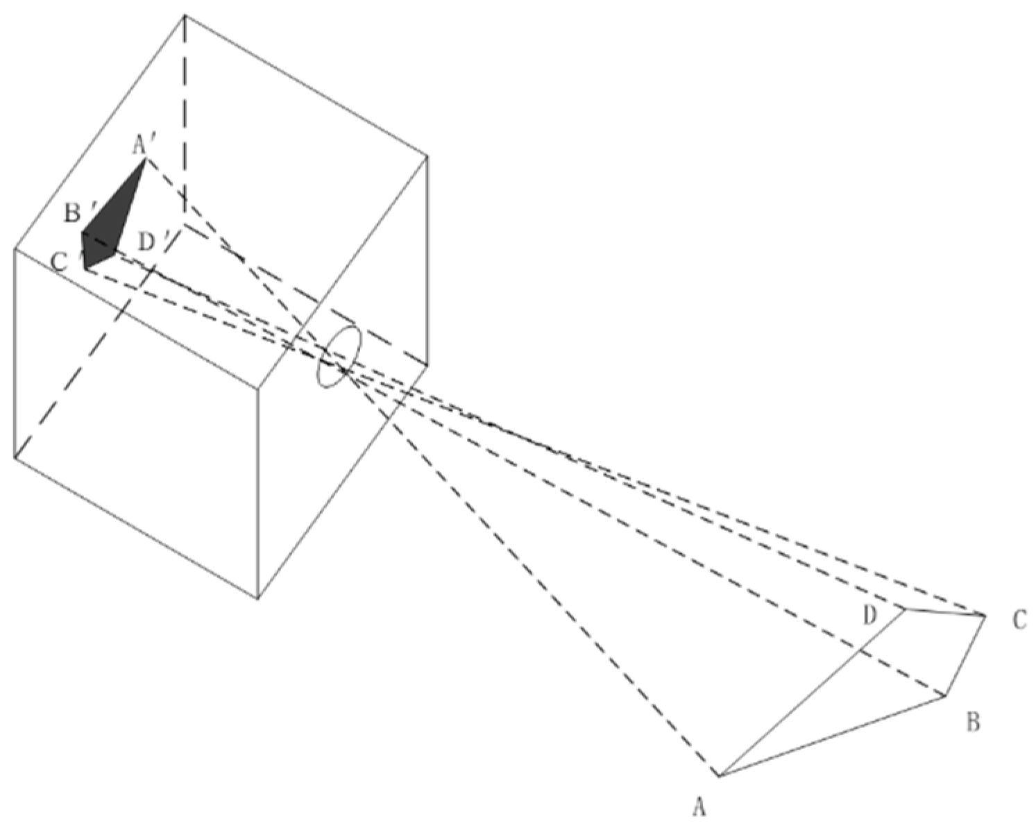 Figure 7. This figure shows quadrilateral ABCD projected to its image A’B’C’D’ via the pinhole.
