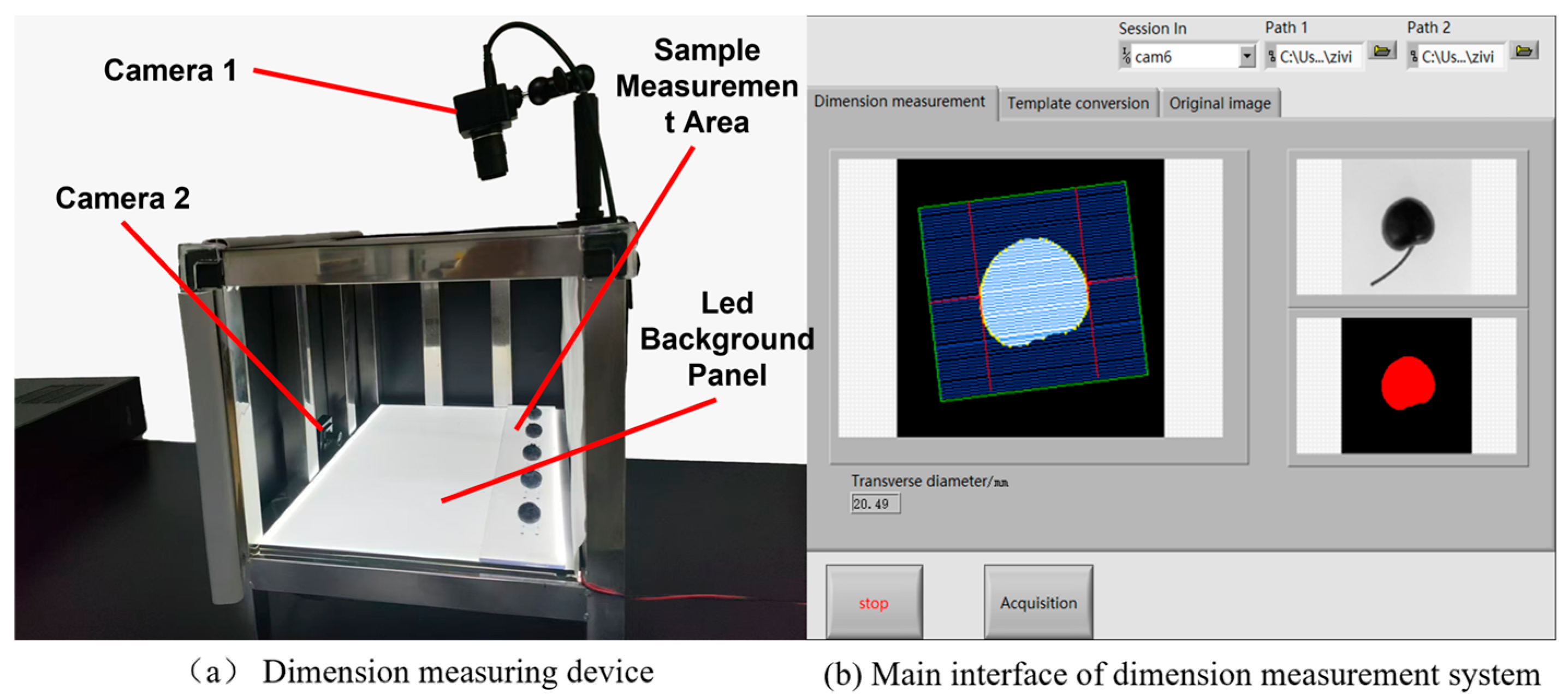 Figure 8 shows the size measurement device’s physical setup and the LabVIEW system’s main interface with real-time transverse diameter display.